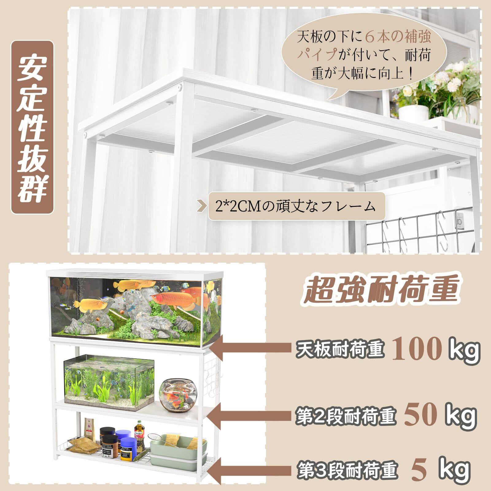 【総耐荷重155kgで支える·幅90×奥行30㎝の広い天板】◆堅牢なステンレススチールを採用した、頑丈な3段式水槽台です。総耐荷重はなんと155kg!水槽、インクジェット複合機や事務用品のストック等、重いものを載せてもしっかり支えます。 ◆幅90×奥行30㎝の広い天板を装備します。収納はたっぷりあるので、上段に水槽、中棚と下棚には魚の餌、漁網、水槽ブラシ、水槽ライト、ポットなどを置いて自由に収納できます。※ページ内に掲載されたいずれ耐荷重の数値は全板面に平均に載せられる場面です。物が均一に棚板に置かれていない場合、ラックが傾く可能性があります。