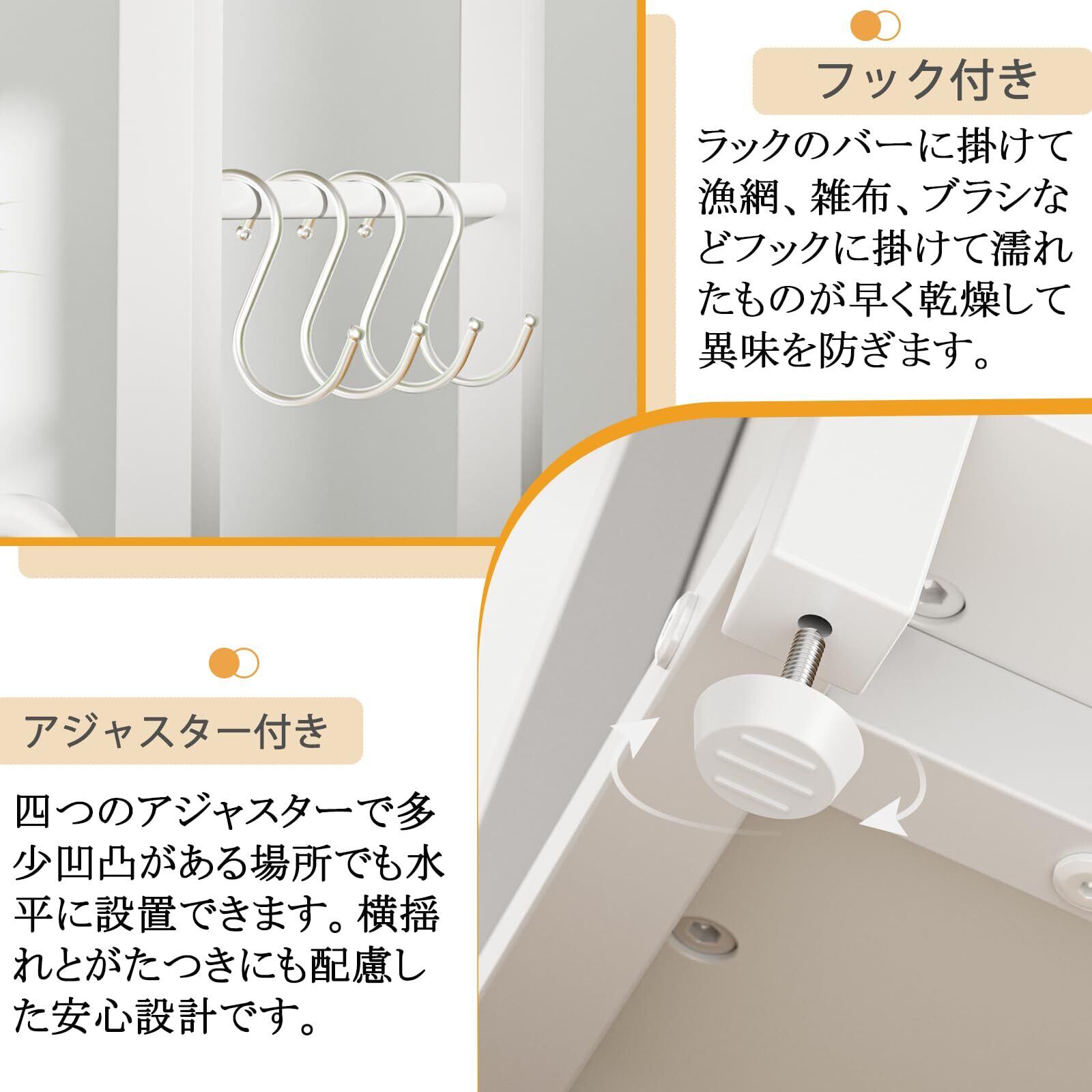 【フック・アジャスター付き】 ➤四つの金属フックが付属しており、フックをラックの側面のバーに掛けて漁網、雑布、ブラシなどフックに掛けて濡れたものが早く乾燥して異味を防ぎます。 ➤四つのアジャスターで多少凹凸がある場所でも水平に設置できます。横揺れとがたつきにも配慮した安心設計です。