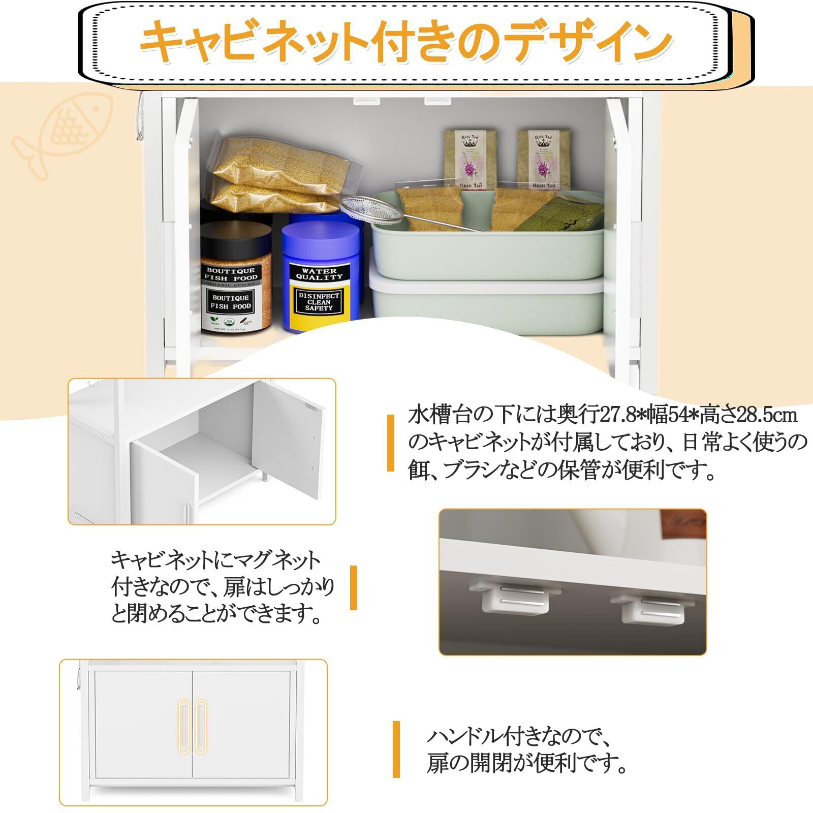 【収納能力抜群】こちらの水槽台は奥行27.8*幅54*高さ28.5cmのキャビネットが付属しており、魚の餌、漁網、ストロー、水槽ブラシ、水槽ライト、ポット、雑貨などをキャビネットにいれて、湿気を効果的に避けることができるだけでなく、物の取り出しにも便利です。