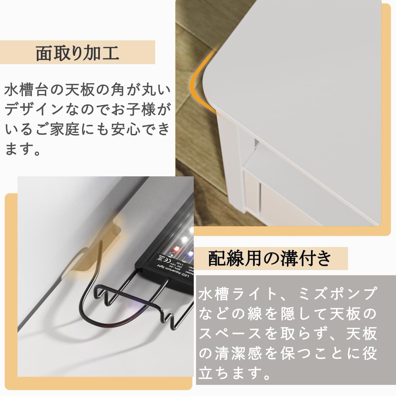 【面取り加工・配線溝付き】 ➤水槽ラックの天板の角が丸いデザインなのでお子様がいるご家庭にも安心できます。万が一子供の頭や大人の肘が当たっても大きな傷をつきません。 ➤配線用の溝が付いており、水槽ライト、ミズポンプなどの線を隠して天板のスペースを取らず、天板の清潔感を保つことに役立ちます。