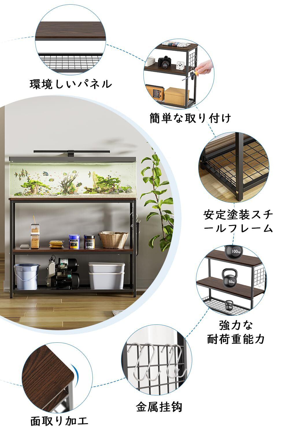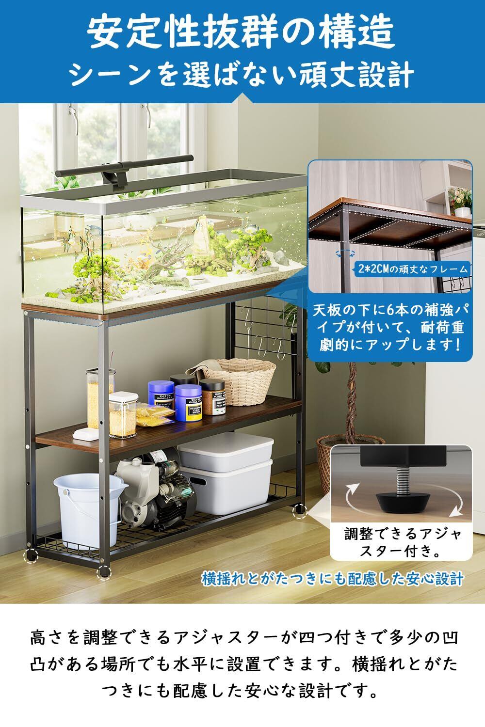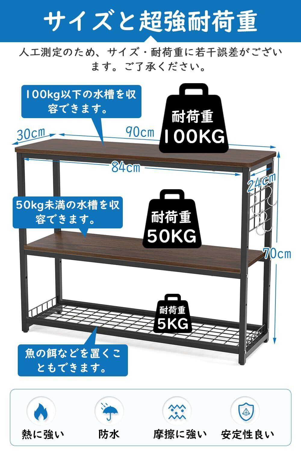 【高品質】棚板は厚さ15mmの頑丈なパーティクルボード製なので、耐荷重抜群です、安定性を心配しません。また、水槽台のフレームは20*20mmのステンレススチール製で強度に強く、錆びにくくて棚に水が落ちてラックが錆びる心配もありません。