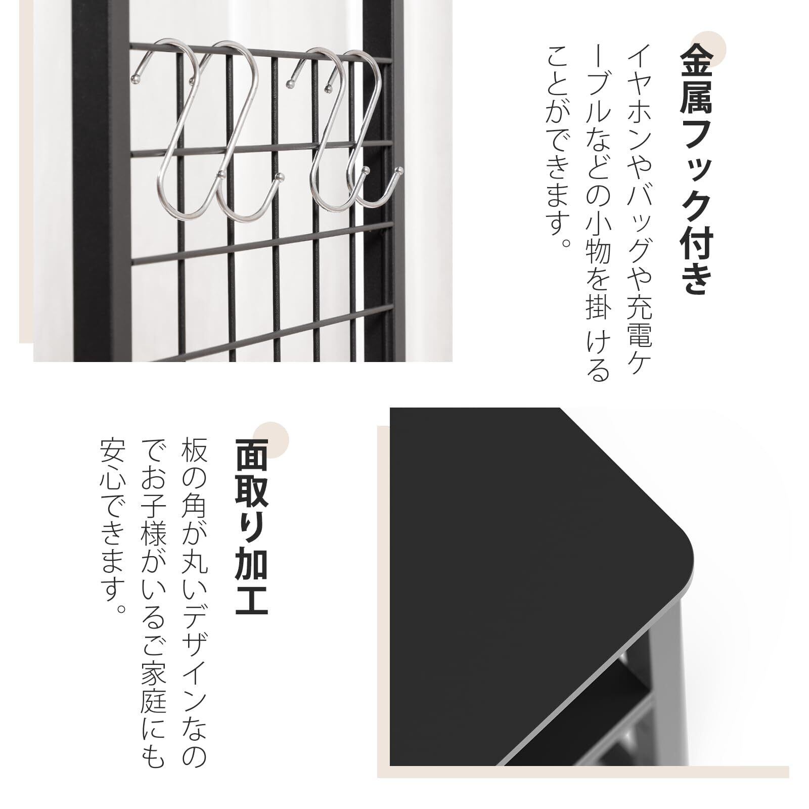 【フックアジャスター付き】金属製のフックが4つ付いており、棚側面のフックに漁網や雑巾、ブラシなどを掛けて簡単に取り出すことができます。濡れたものもすぐに乾き、嫌な臭いも軽減します。 防ぐ。 4つのアジャスターを装備しているので、多少の凹凸のある位置でも水平に設置できます。横揺れやガタつきに配慮した安全設計です。