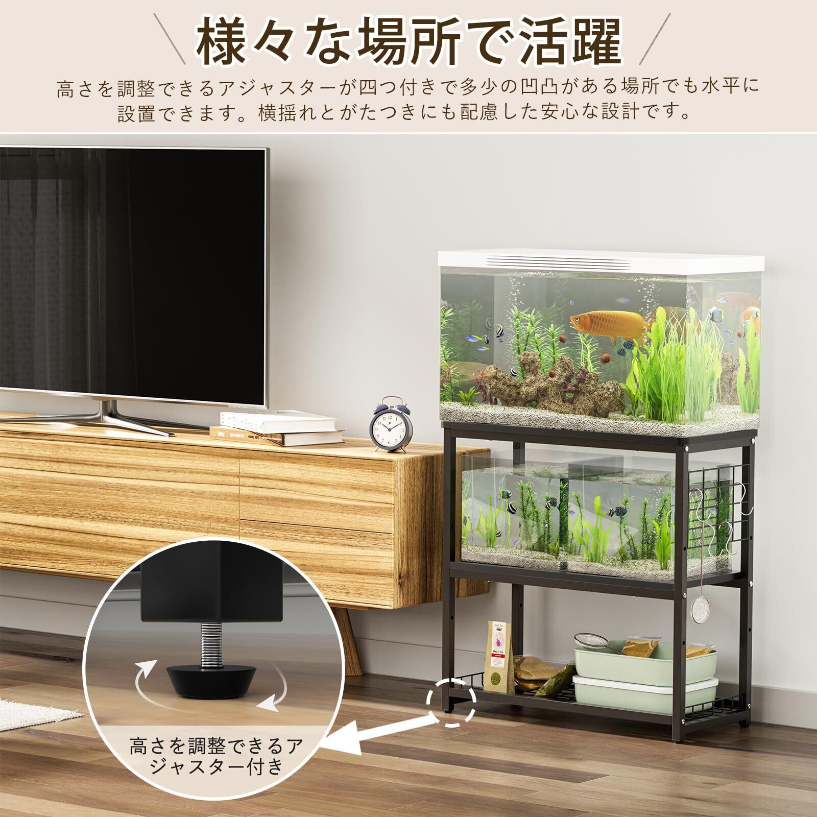 【広い収納スペース】天板に水槽が置けるので、ボードスペースが広く、魚の観察や餌付けに65*30の水槽を簡単に置くことができます。 魚の餌、漁網、水槽用ブラシ、水槽用ライト、鉢植えなどを中段と下段に置いて簡単に取り出すことができます。
