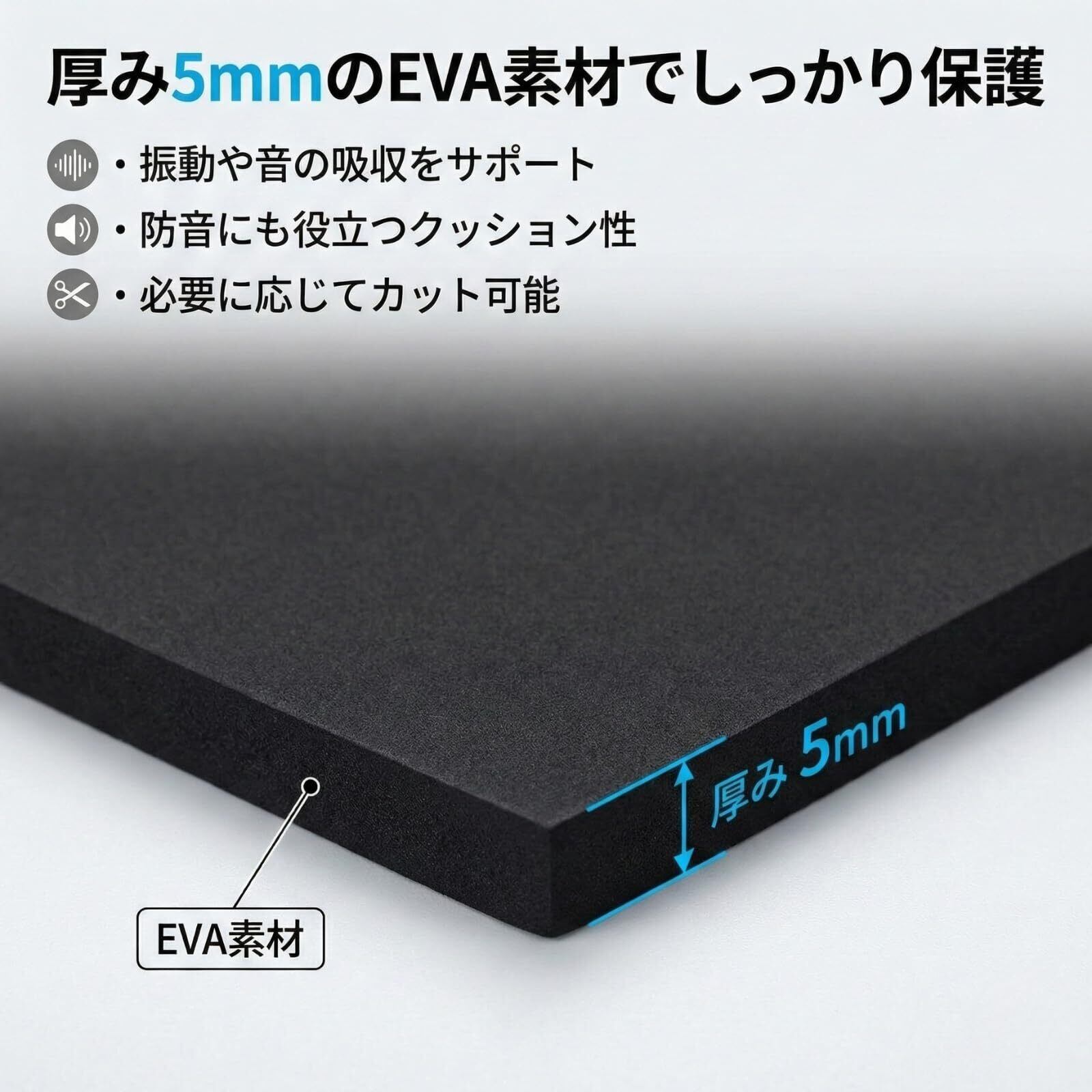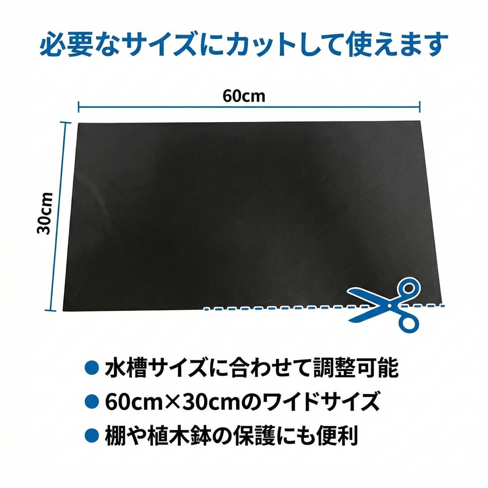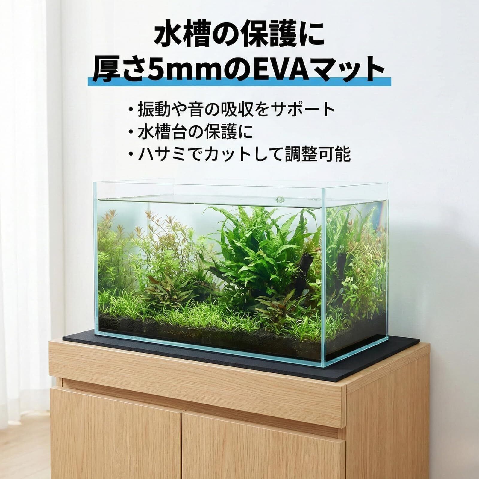 EVA水槽用プロテクションマットは、水槽に最適な高品質アイテムです。振動を吸収し、家具を守ることで、水槽の設置をより安全で快適にします。厚み5mmのEVA素材は耐久性抜群で、サイズ調整が可能で、多目的に活用できます。シンプルな設置で、初心者からプロまで安心してお使いいただけます。」
