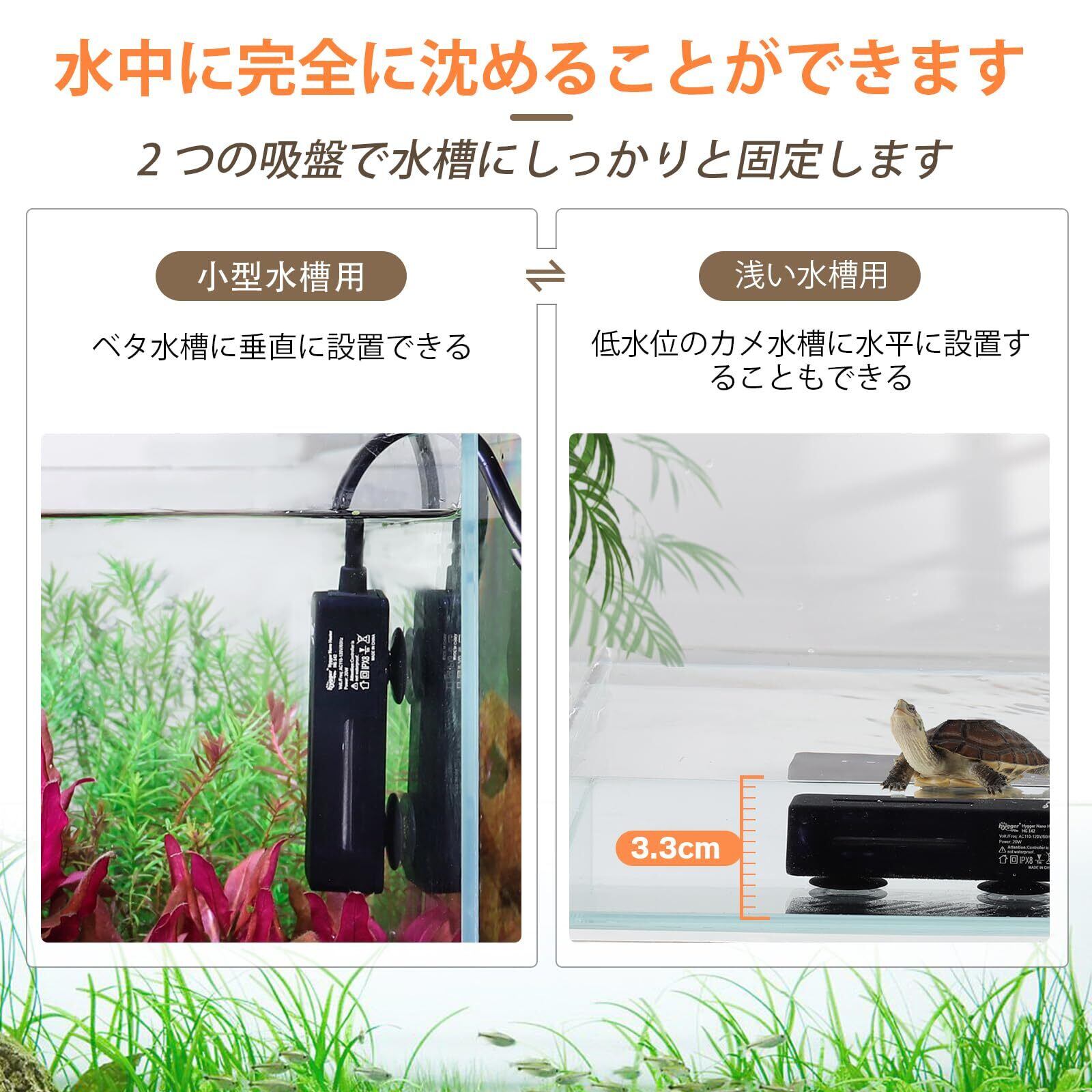 【小型水槽に最適】20Wの小型水槽ヒーターは、わずか長さ10.2cm×高さ2.5cmの超小型設計。3〜20Lの小型水槽に最適で、場所を取らず、設置も簡単です。シンプルな黒い外観は水槽内で目立ちにくく、レイアウトを邪魔しません。また、浅瀬のカメ水槽など、小型アクアリウムにもぴったり。省スペースながらも高性能で、ペットの快適な環境をサポートします。