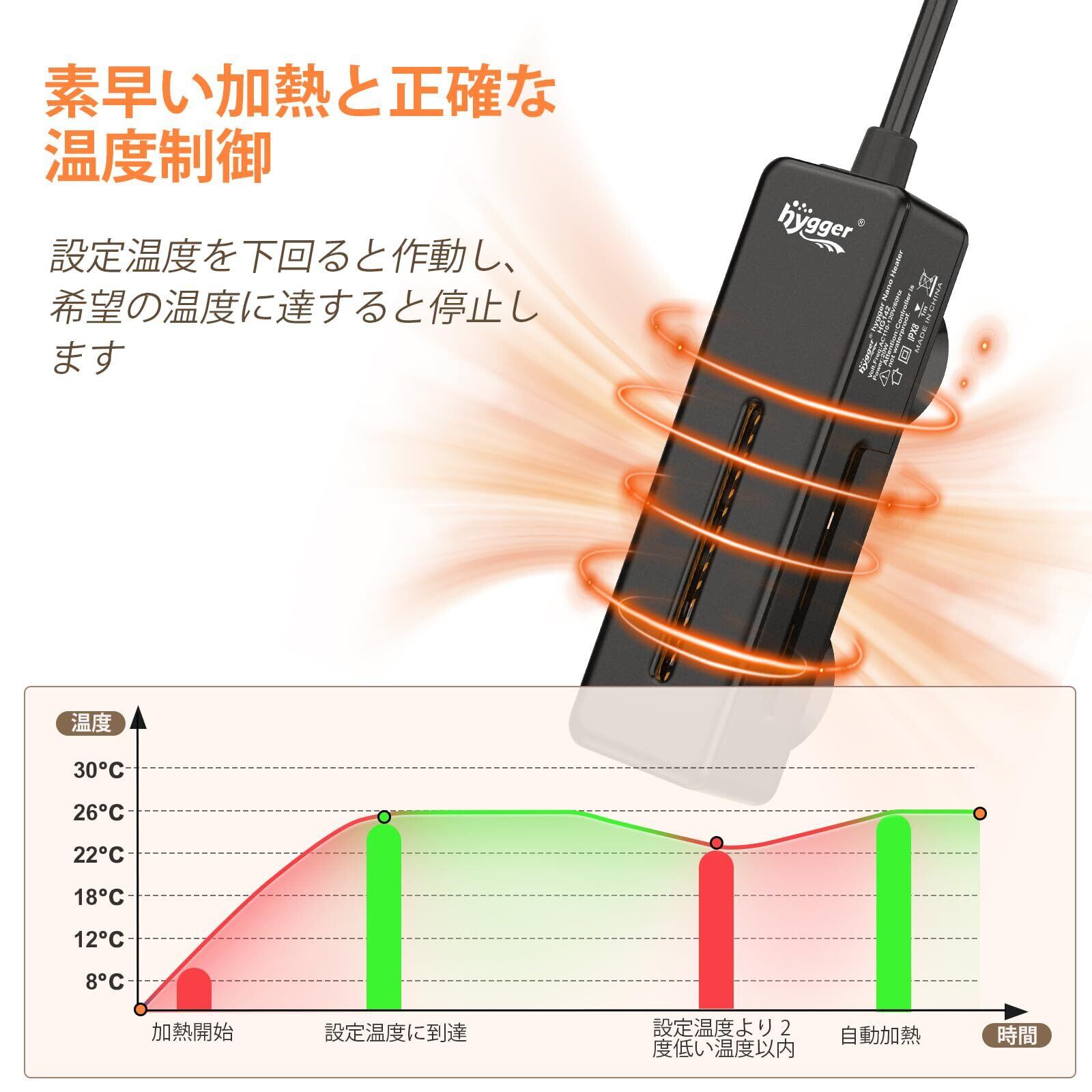 【安全性が一番】hyggerヒーターを設置する際は、必ず加熱棒全体を水に浸し、付属の2つの吸盤を使って水槽の壁に垂直または水平に固定してください。水交換や掃除を行う前には、必ずプラグを抜き、ヒーターを15分以上冷ましてから作業を行ってください。※注意:水から出した状態での通電は故障や事故の原因となります。必ず水に浸した状態でご使用ください。