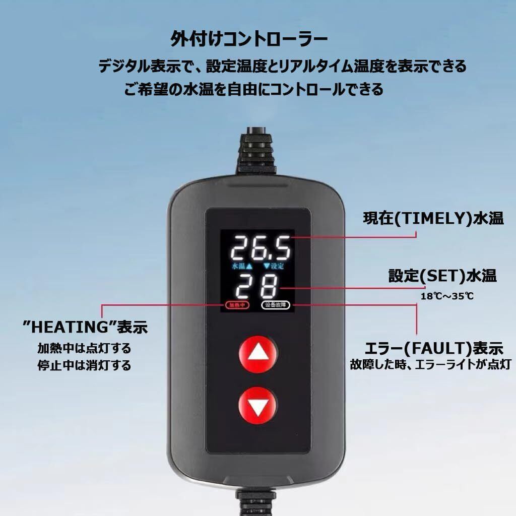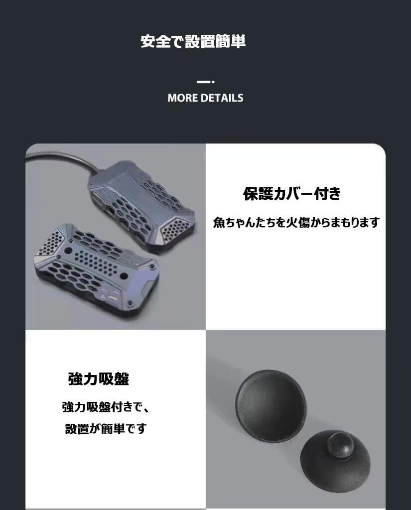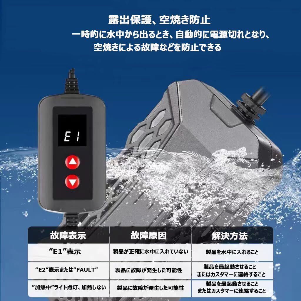 エラー表示機能:水槽 ヒーターが一時的空気中に露出した場合や、何かの不適切でご使用なさった場合、エラー表示をして、安全の上、タイムリーに問題を解決することができます。