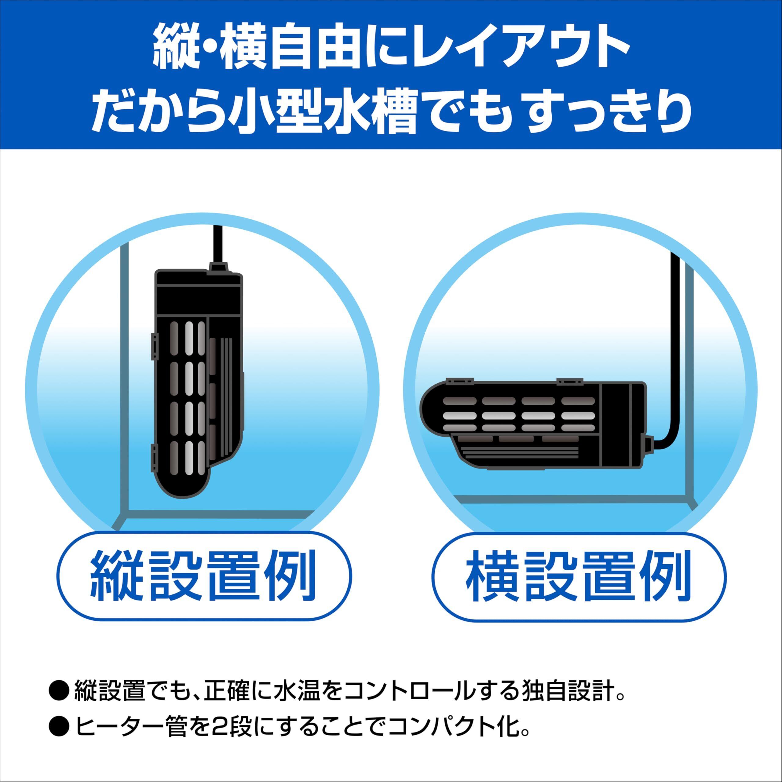 水温の管理には、必ず水温計を併用してチェックしてください ・本製品には、水温を下げる働きはありません ・エアレーション又は、ろ過装置を使用し水槽内の水が撹拌されている状態の水槽で使用してください ・適用水槽サイズは周囲温度が15℃以上の環境の場合です。15℃に満たない場合は希望水温にならない場合があります