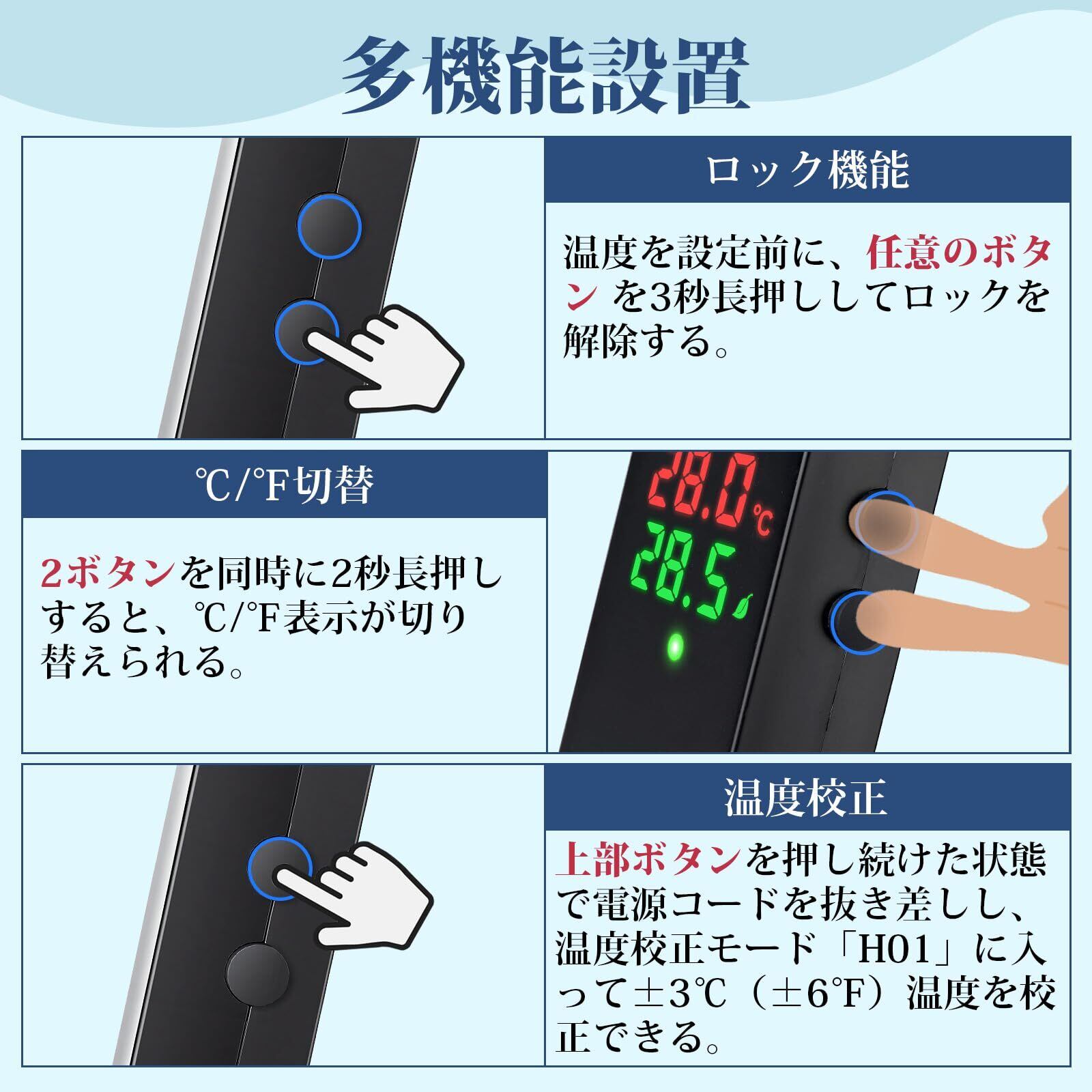 【温度校正機能】上部ボタンを押し続けた状態で電源コードを抜き差しし、画面に「H01」が表示されたら温度校正モードに入ります。小数点の前後の桁が点滅している間は、上部/下部ボタンで校正温度を調整できます。設定後、表示の点滅が数秒で止まれば校正完了です。校正可能範囲は±3℃(±6℉)であり、これを超えると全ての校正値がクリアされますのでご注意ください。