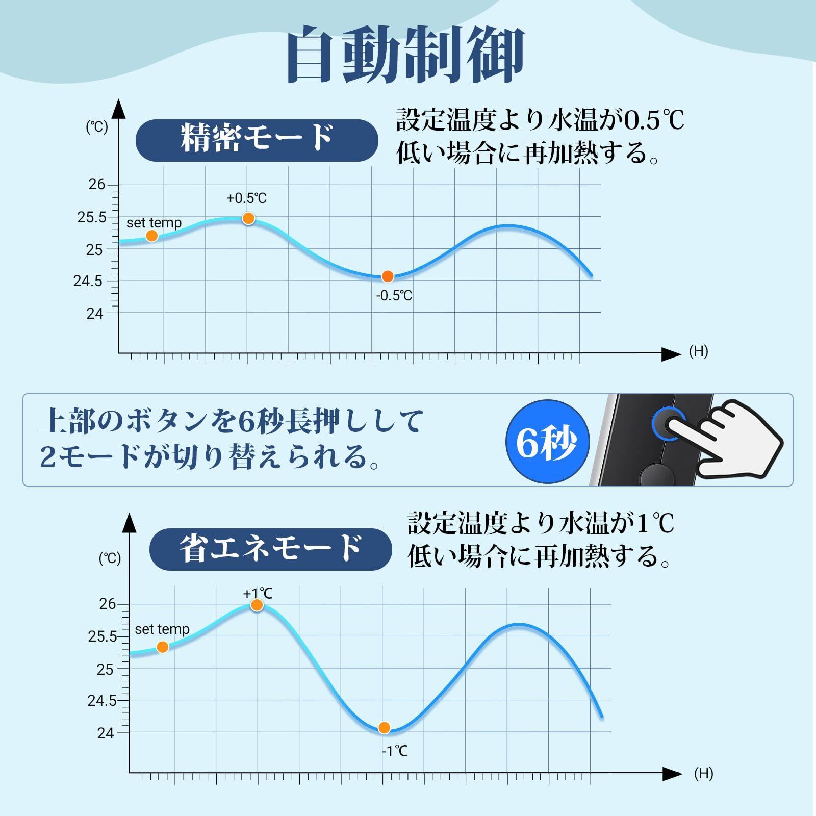 【精密・省エネモード】水槽ヒーターは精密や省エネの2モードがあります。精密モードは、設定温度より水温が0.5℃低い場合に自動加熱し、省エネモードは1℃低い時点で加熱するため、精密モードより半分のエネルギーで済みます。上部のボタンを6秒長押しして2モードが切り替えられます。省エネモードが選択されている場合、対応するアイコンが常時点灯します。