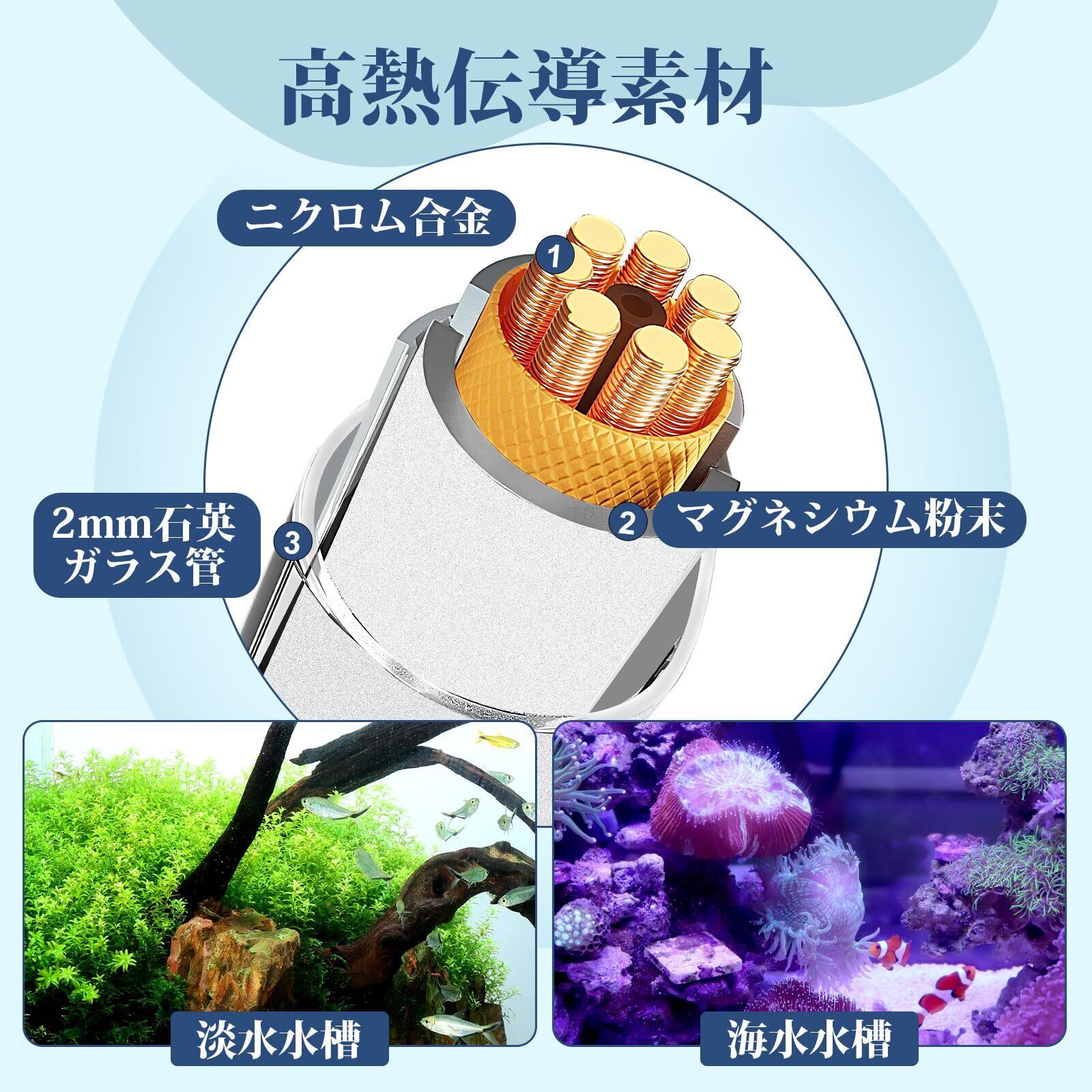 【自動温度制御・℃/℉切替】2つの水温センサーとサーモスタットが内蔵された水槽用ヒーターです。お好みの温度を設定すると、ヒーターが水温を自動的に感知し、設定温度より低いときは加熱し、高いときは加熱を停止し、水温を安定させます。コントローラーの上下2ボタンを同時に2秒長押しすると、摂氏(℃)と華氏(℉)の表示方法が切り替えられます。