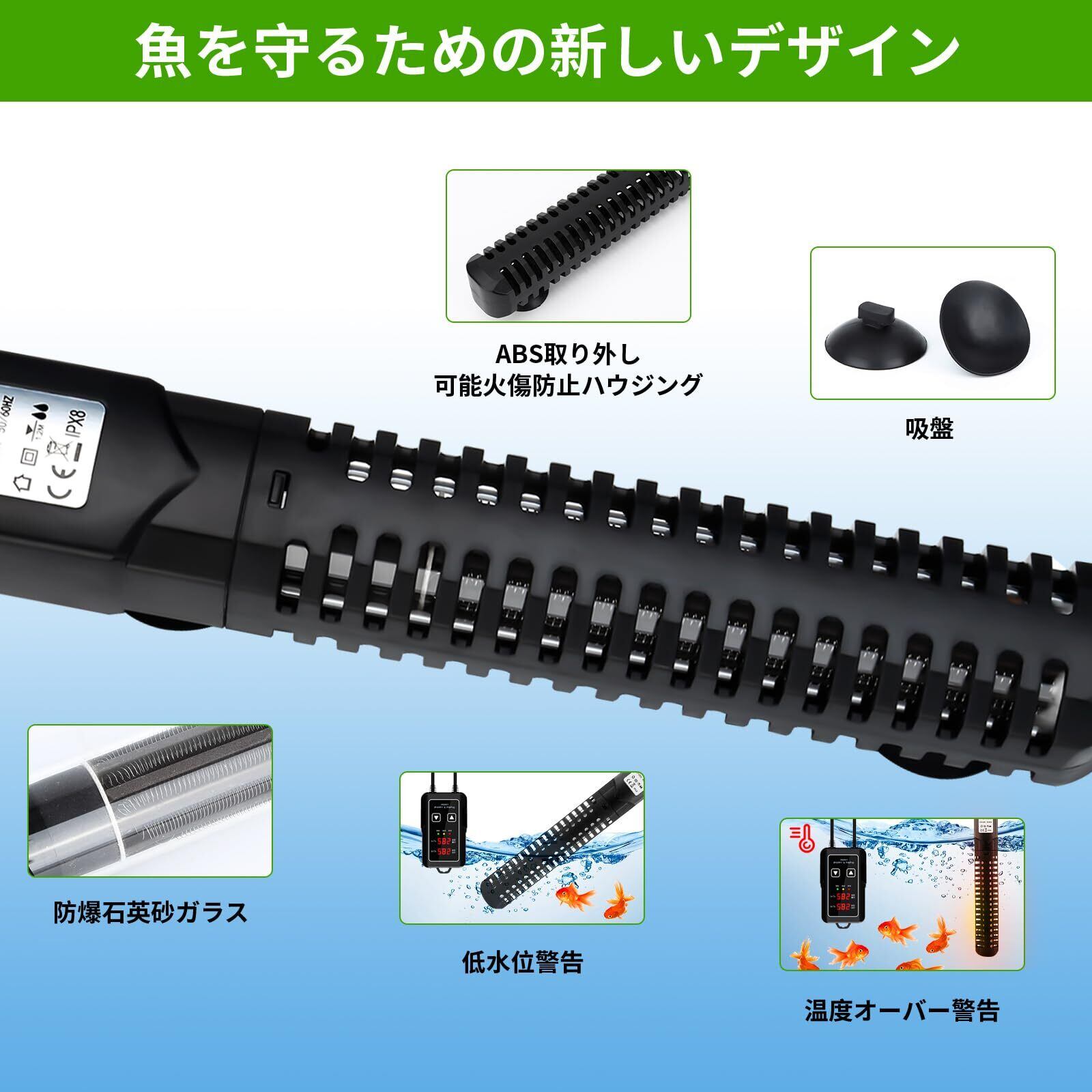 【過熱保護、安全加熱】過熱保護機能付き、温度センサーを内蔵していて、空焚き事故を防止でき、一定温度を超えると温度センサーが働き加熱を停止します。水温が設定温度より低くなるとヒーターが自動的に加熱を開始します。ヒーターは完全に水に浸されていない場合や水不足の状態では、自動的に電源が切れます。高度な耐トラッキング性/難燃性プラグを採用しています。水槽ヒーターの絶縁性にも優れ、淡水/海水のどちらにでも安心してお使いいただけます。