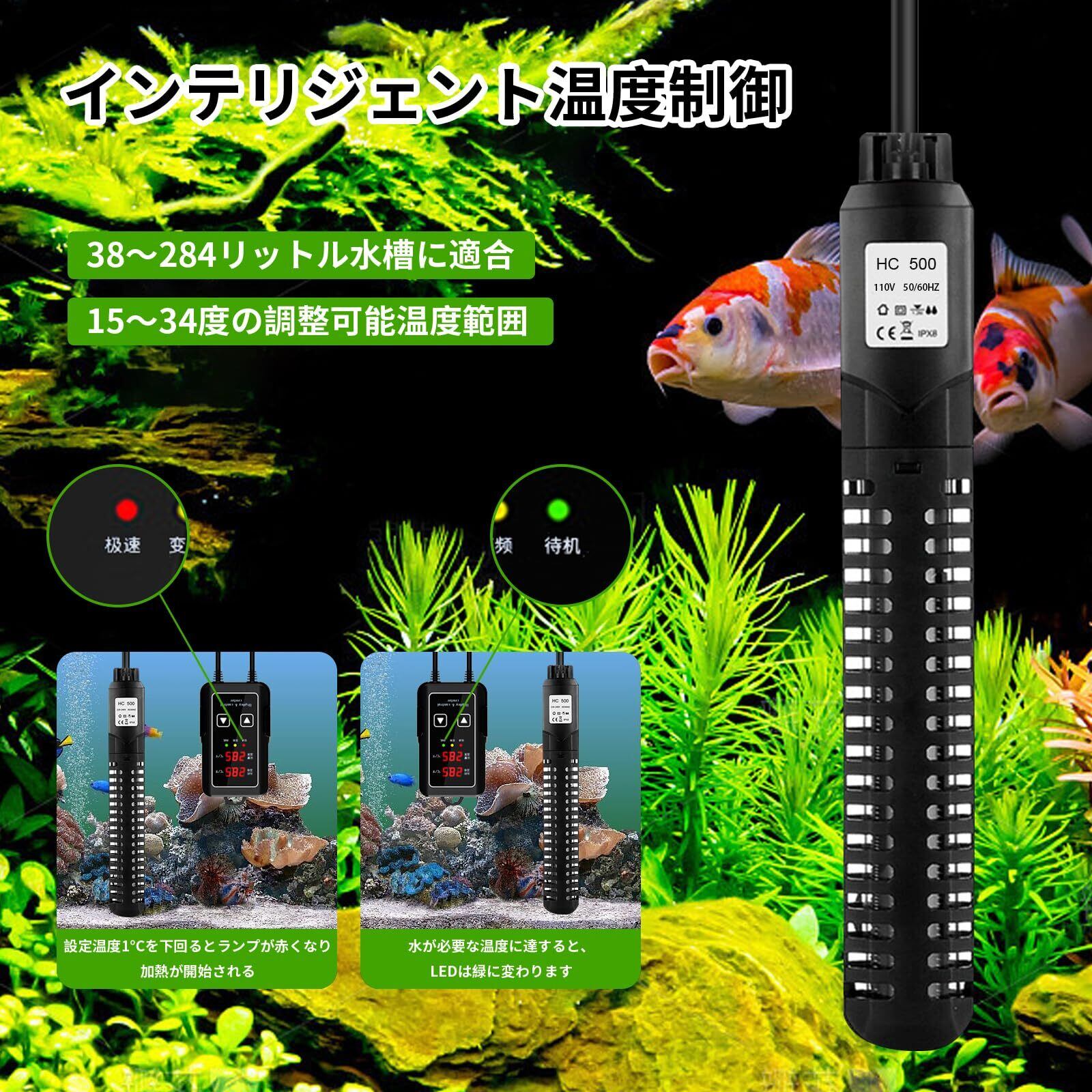 HUIZHOU 水槽 ヒーター オートヒーター,LED ディスプレイ,温度15度~34度可調節, 省エネ 防水 ヒーター, 縦横設置,石英防爆ガラス セーフカバー 吸盤付き, 熱帯魚 観賞魚 淡水海水両用 (500W)