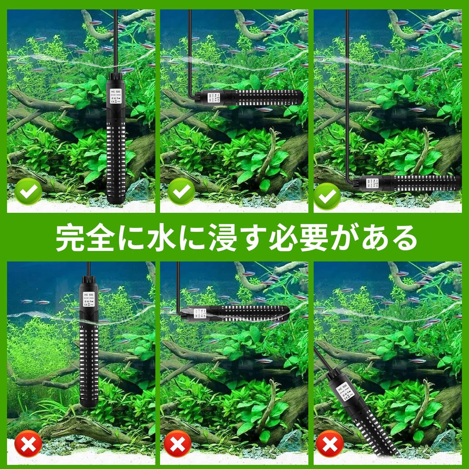 【保護カバー設計で、小魚の火傷を防止】従来の石英製ヒーターとは異なり、このヒーターは、加熱部分である石英棒の外側にABS素材の保護カバーを装備しています。これにより、ペットが加熱部分に触れて火傷するリスクを効果的に防ぎます。魚やカメがヒーターに近づいても、安全が確保されており、安心して使用いただけます。推薦水槽サイズ:300W「水槽 ヒーター60cm-90cm用」500W「水槽 ヒーター90cm-120cm用」