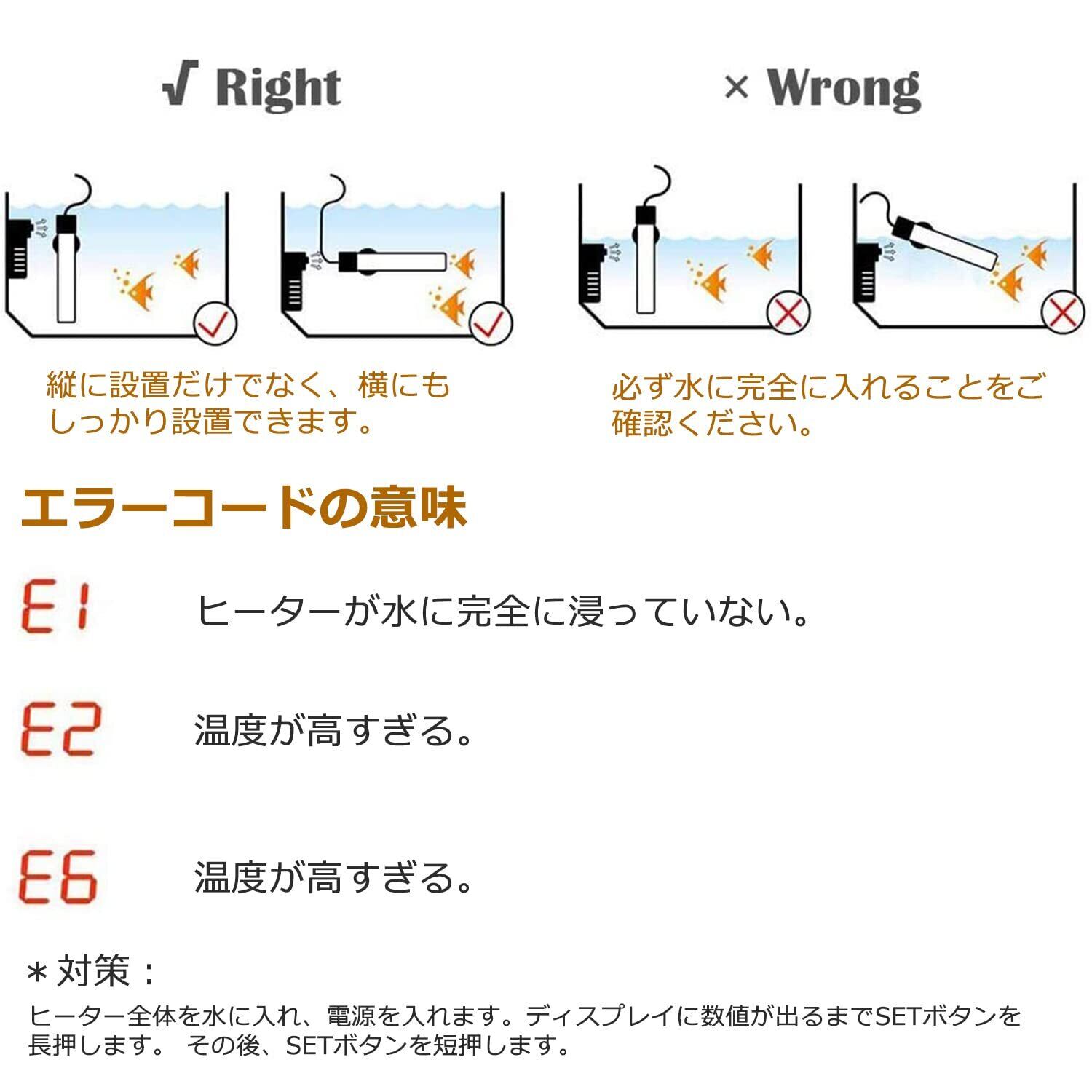 【安全性、さらに強化! 】難燃性カバー付きで、ヒーター部の熱から人の手や魚を守ります。カバーは取り外してお手入れ可能です。異常加熱を感知すると自動的に電源やヒューズを切るような安全装置が搭載されています。また、万一の空焚き(空気中の加熱)時にはLEDディスプレイをE1に表示し,加熱を停止することによりヒーターをより保護することができます。