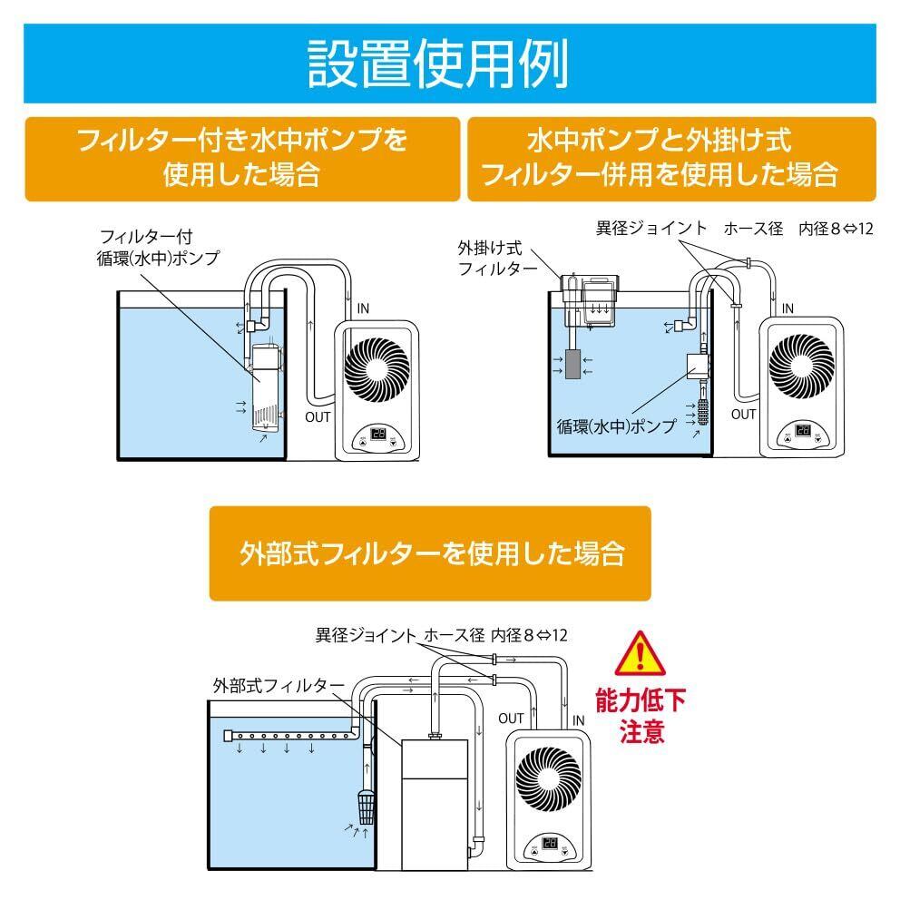 ※本製品の稼働には循環ポンプが別途必要です。流量目安約1.5~8.5リットル/分の循環ポンプ(水中ポンプ)か外部フィルターをご用意ください。