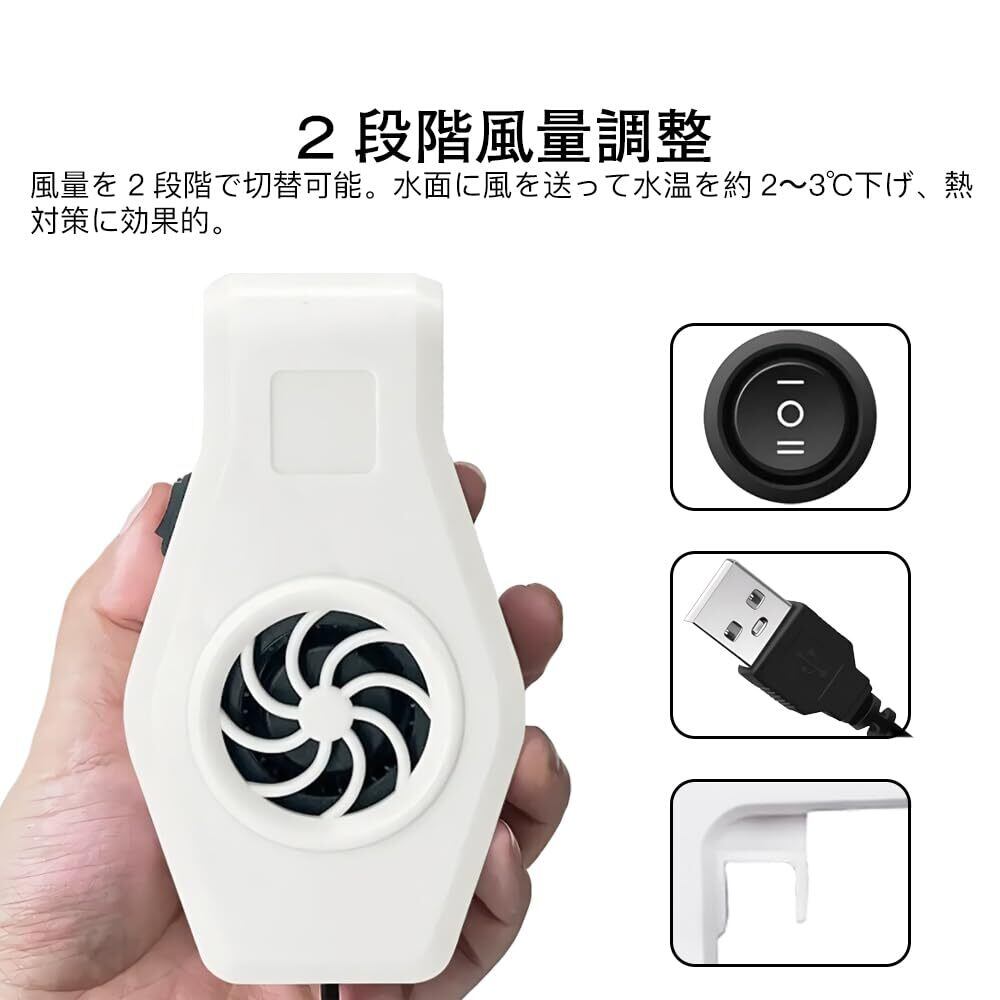 2段階風量調整:風量を2段階で切替可能。水面に風を送って水温を約2〜4℃下げ、熱対策に効果的。