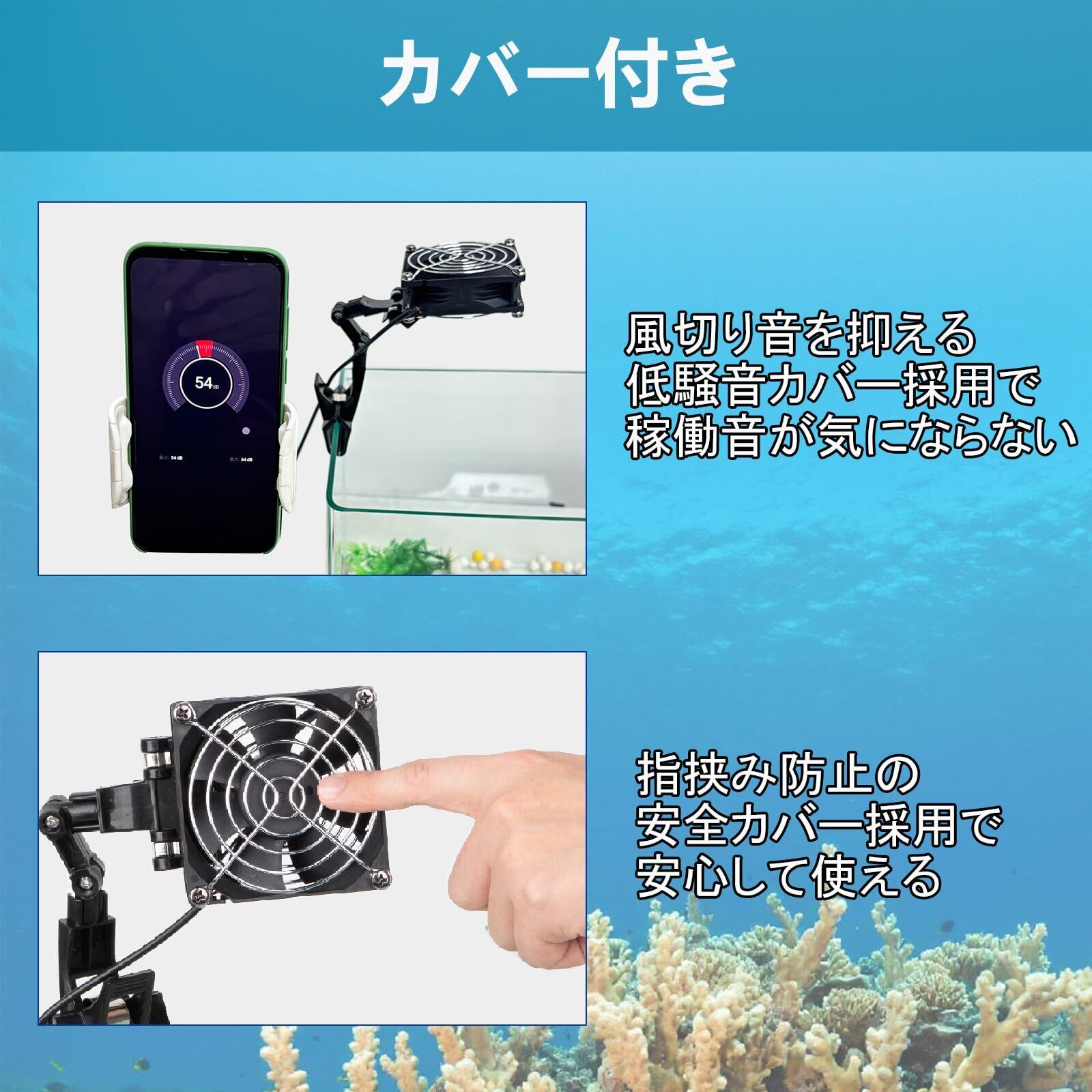 低騒音:風切り音を抑える低騒音カバーを採用で稼働音が気にならなく、かつ全方向指挟み防止の安全設計を実現します。小型だから水槽の見た目もスッキリ。少ないスペースで設置できるので、あまり目立たせたくない方や、ファンの音が気になる方におすすめです。