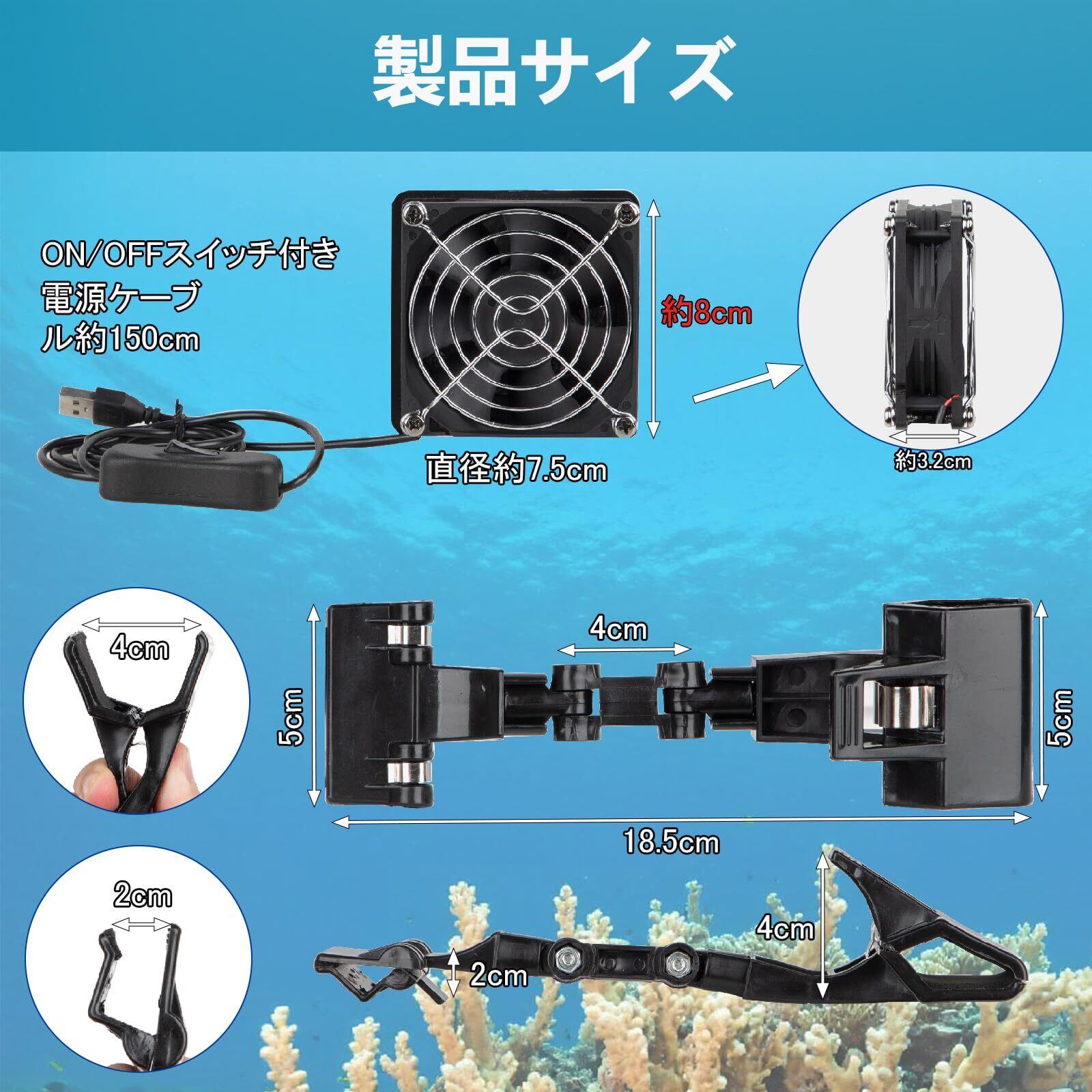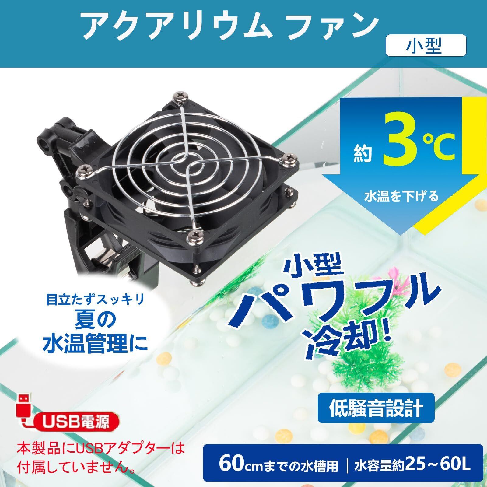 「ご注意」●適合水槽・水容量:幅60㎝以下の水槽・約25~60L ●コード長:約1.5m(中間スイッチ含む) ●定格電圧・消費電力:DC 5V・1.0W ●USBアダプターは別売りです(DC 5V 1A以上) ●冷えすぎを防止したい場合は、サーモスタット(別売)をご使用ください。