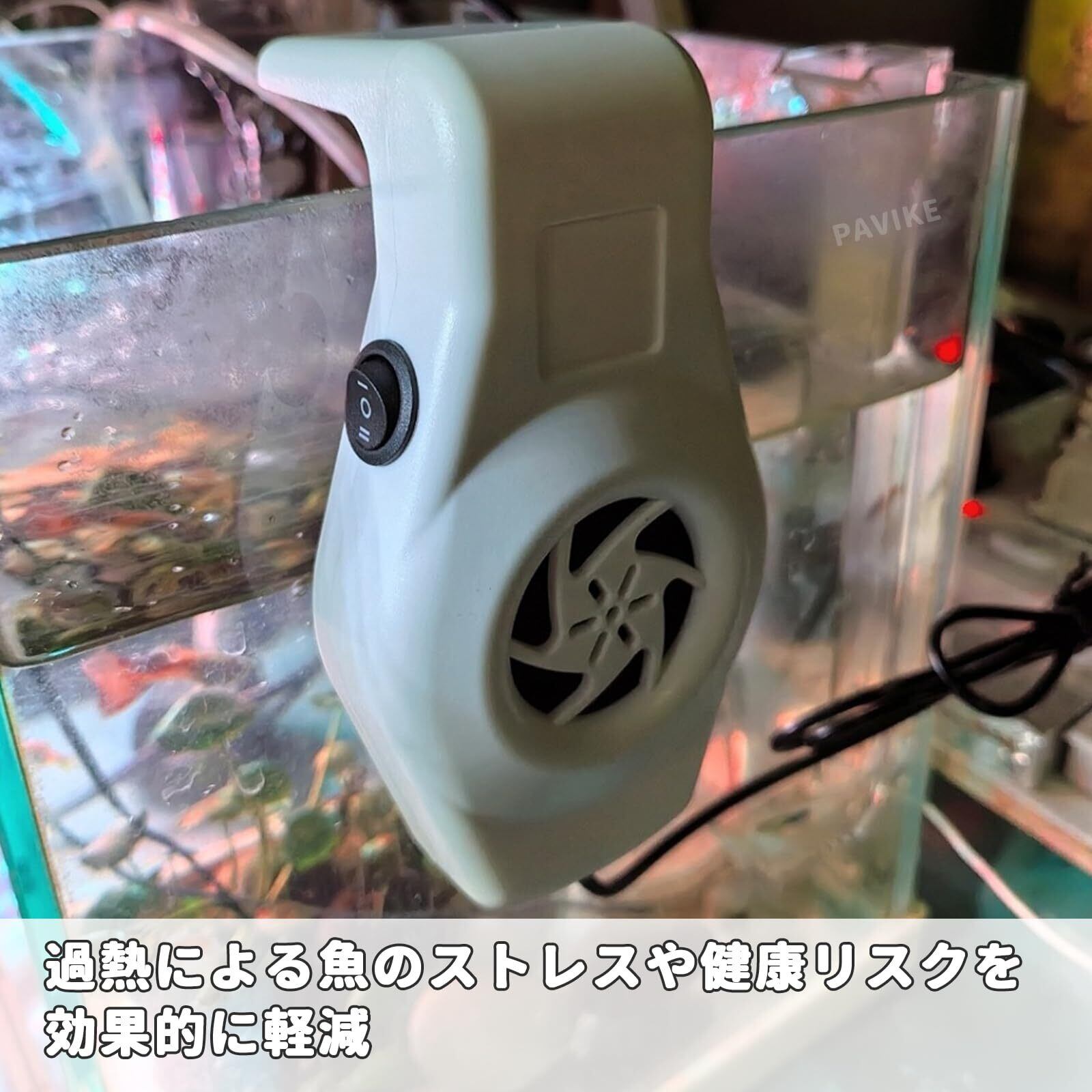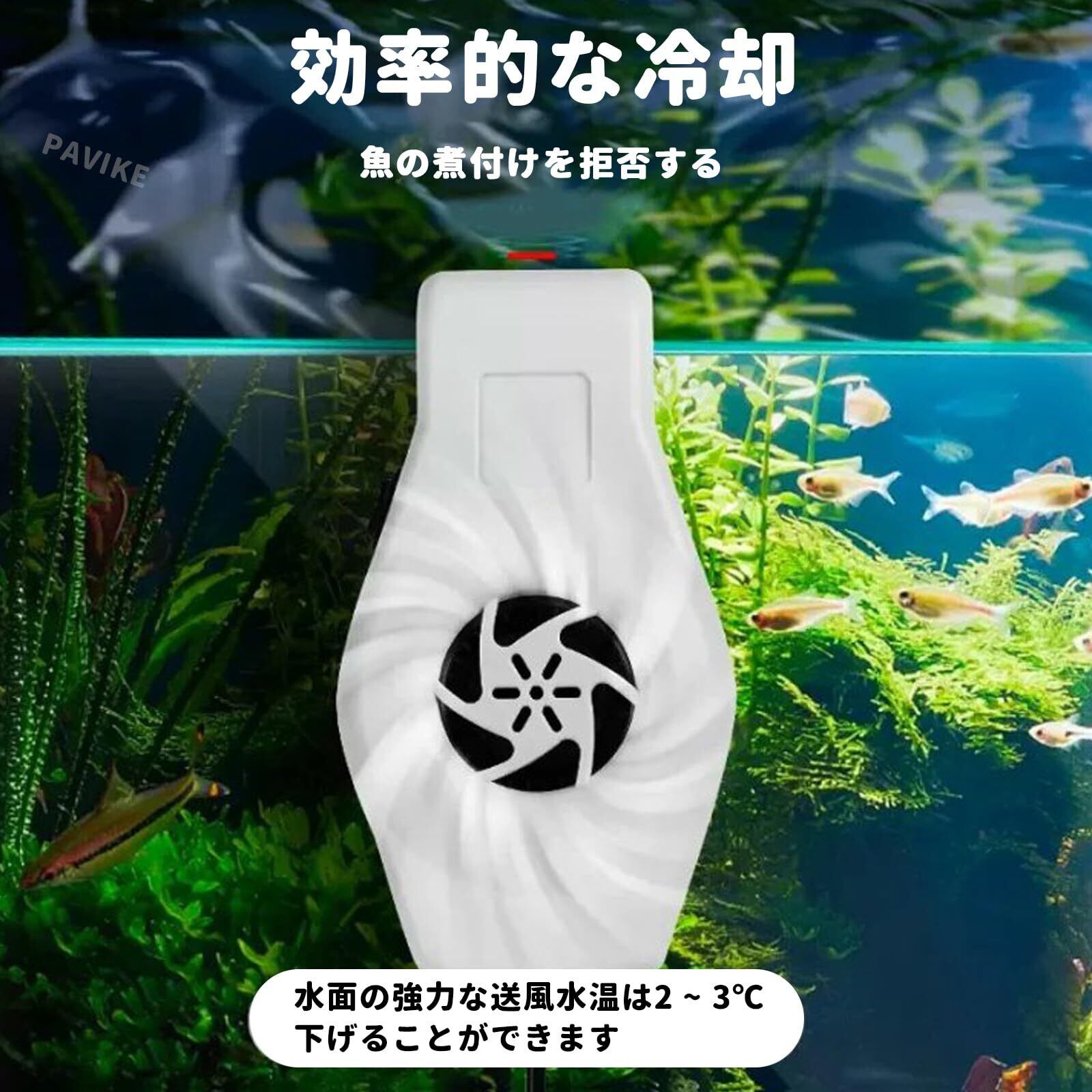 効果的な水温管理 × ストレス軽減USB 駆動の小型ファンにより、水槽内の温度上昇を効果的に抑制。夏場の高温時に魚のストレスや健康リスクを軽減し、安定した水温環境を提供します。水面への送風により自然な温度調整を実現します。