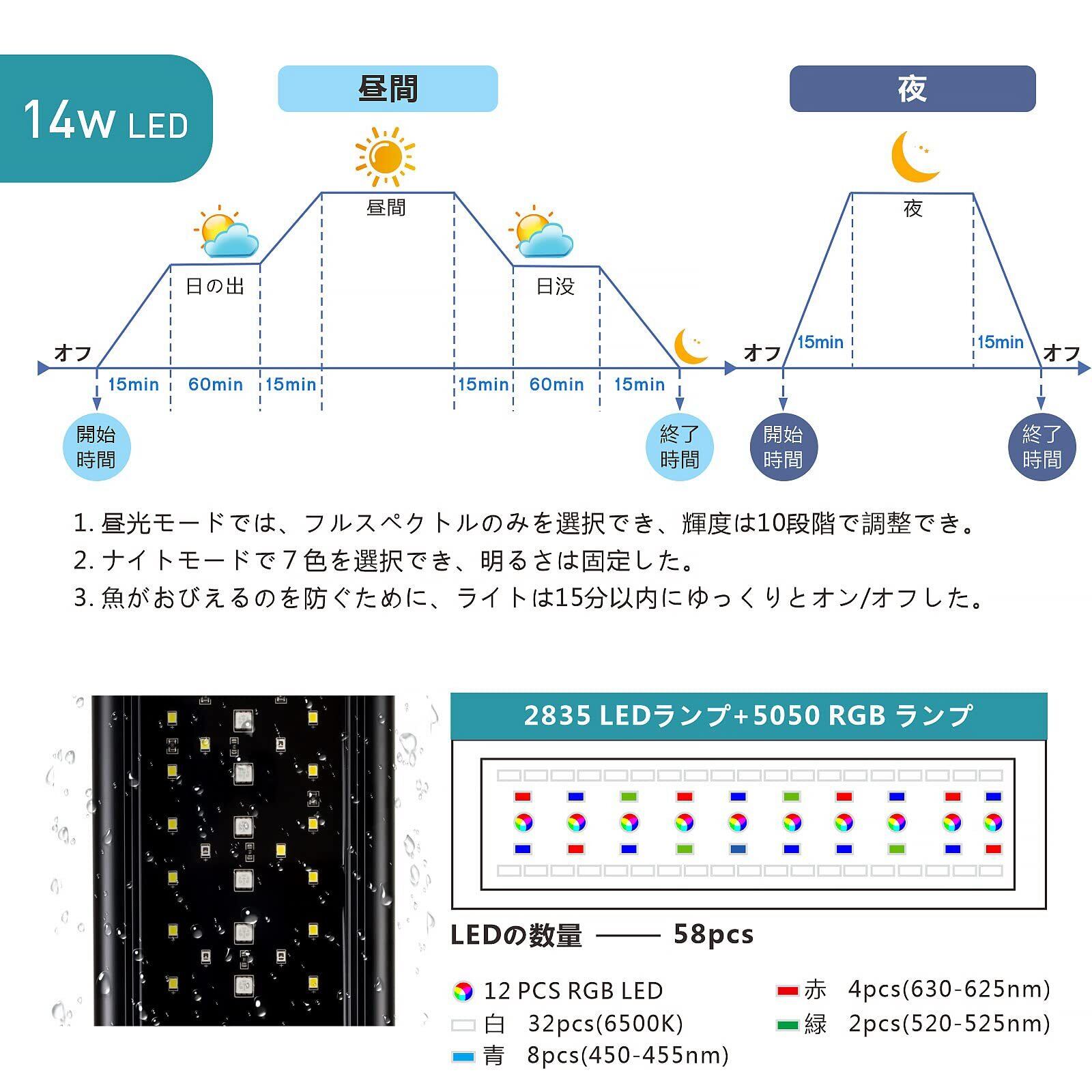 【防水・放熱性】IP68防水ランプ、お手入れが簡単です。 取り外し可能なアダプターは、破損した場合でも、1つのアクセサリを交換するだけでいいです。 パワーオフメモリー機能は、電源が復旧した後、ローカル時間を設定するだけで、ライトが以前の設定に従って実行されます。伸縮式ベンディングブラケットの長さは調整可能で、取り付けが簡単で、様々なサイズの淡水水槽に適しています。