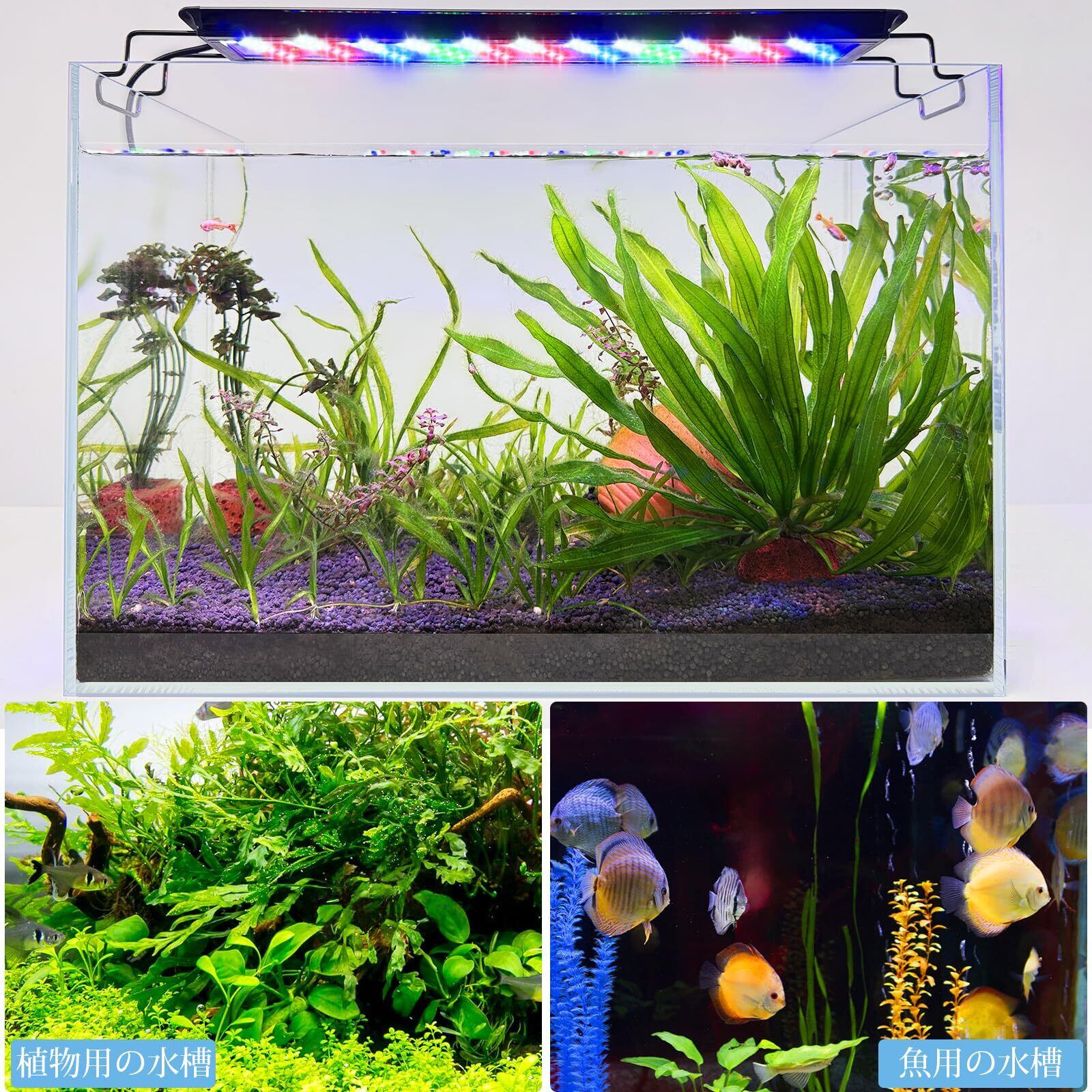 【フルスペクトル】この14W LED水槽ライトは96個の高輝度4色LEDビーズ(白色40個、赤色24個、青色20個、緑色12個)を搭載。太陽光を効果的に再現し、水草の成長を促進するだけでなく、魚の色彩を引き立て、ダイナミックで自然な水中景観を作り出します。