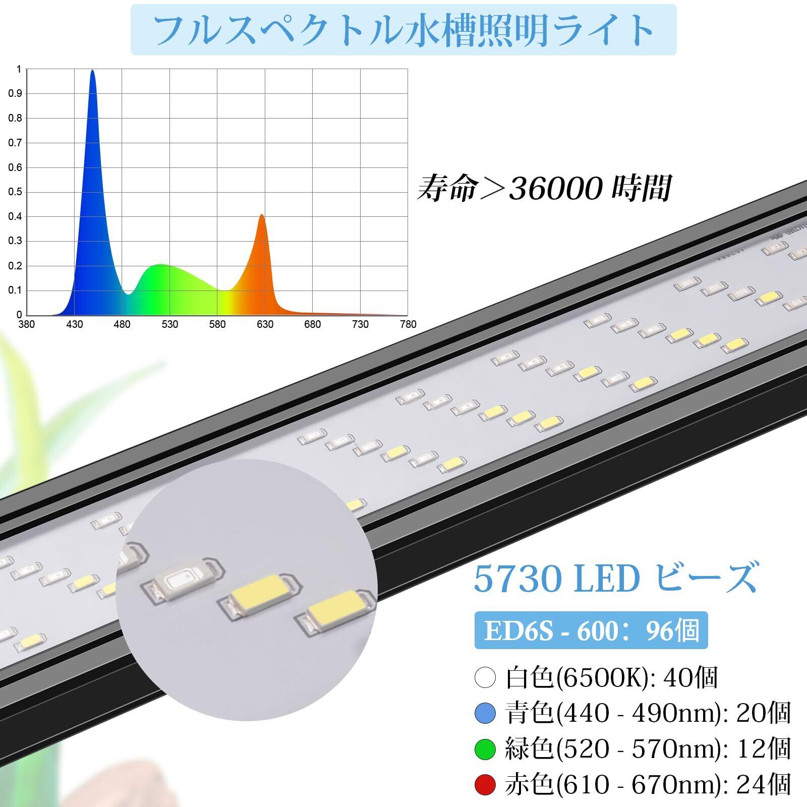 【耐久性】この水槽用LEDライトは2本の伸縮式金属ブラケット(片側ブラケット長さは17cm)を備え、簡単で安定した取り付けが可能です。高品質5730 LEDビーズを採用し、高演色性82CRI、高輝度、長寿命(36,000時間以上)を実現。長期間にわたる信頼性の高い操作と美しい照明をお楽しみいただけます。