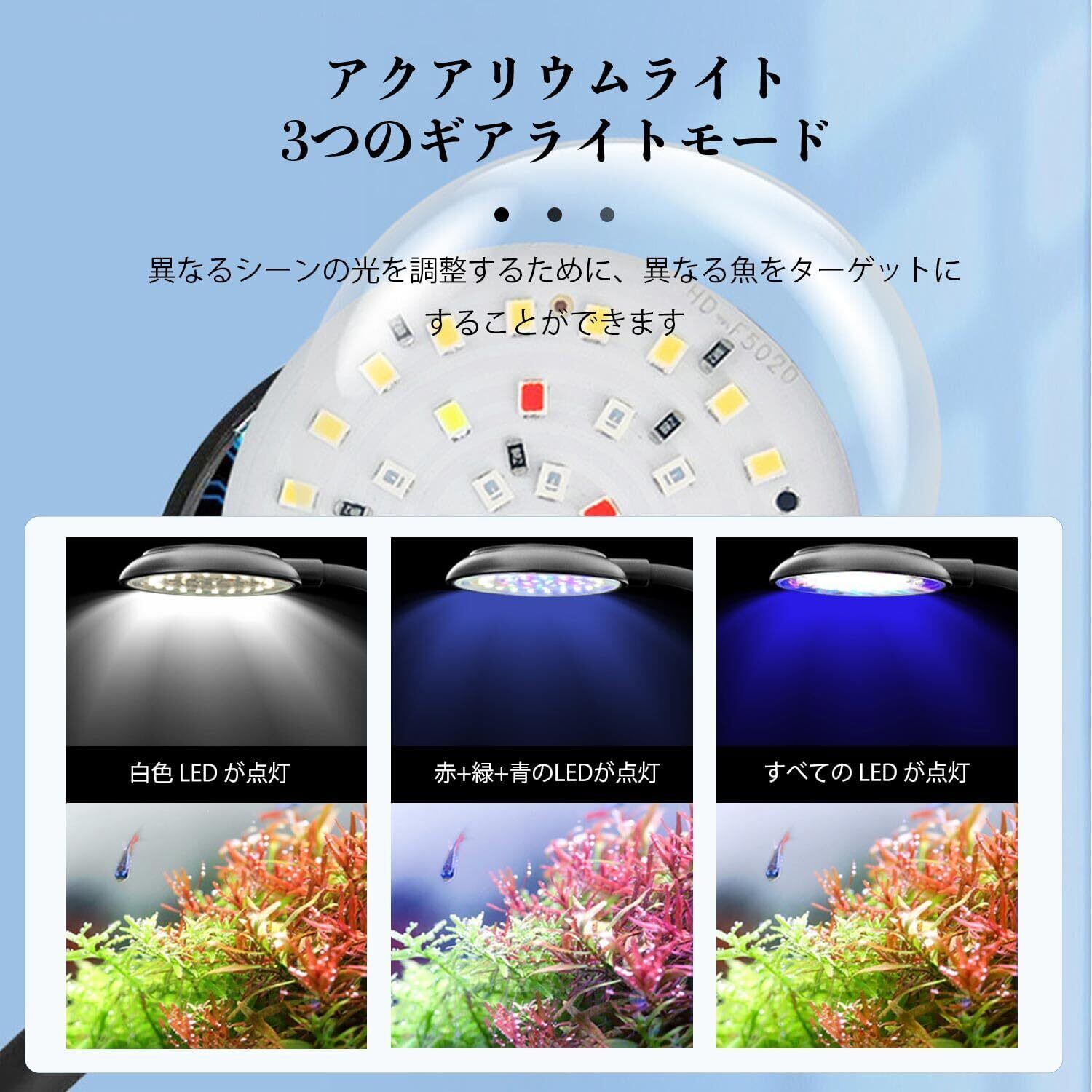 【4色 /3つの照明モード】28個のLEDビーズ(白14個+青6個+赤4個+緑4)を使用しています。3つの照明モード(モード1:白色のライトが点灯。モード2:赤色、青色、綠色のライトが点灯。モード3:すべてのライトが点灯)を備えており、異なった使用ニーズを満たすことができます。自然光を模倣し、水草の光合成を促進することで、魚、水草、水の美しさを演出することができます!
