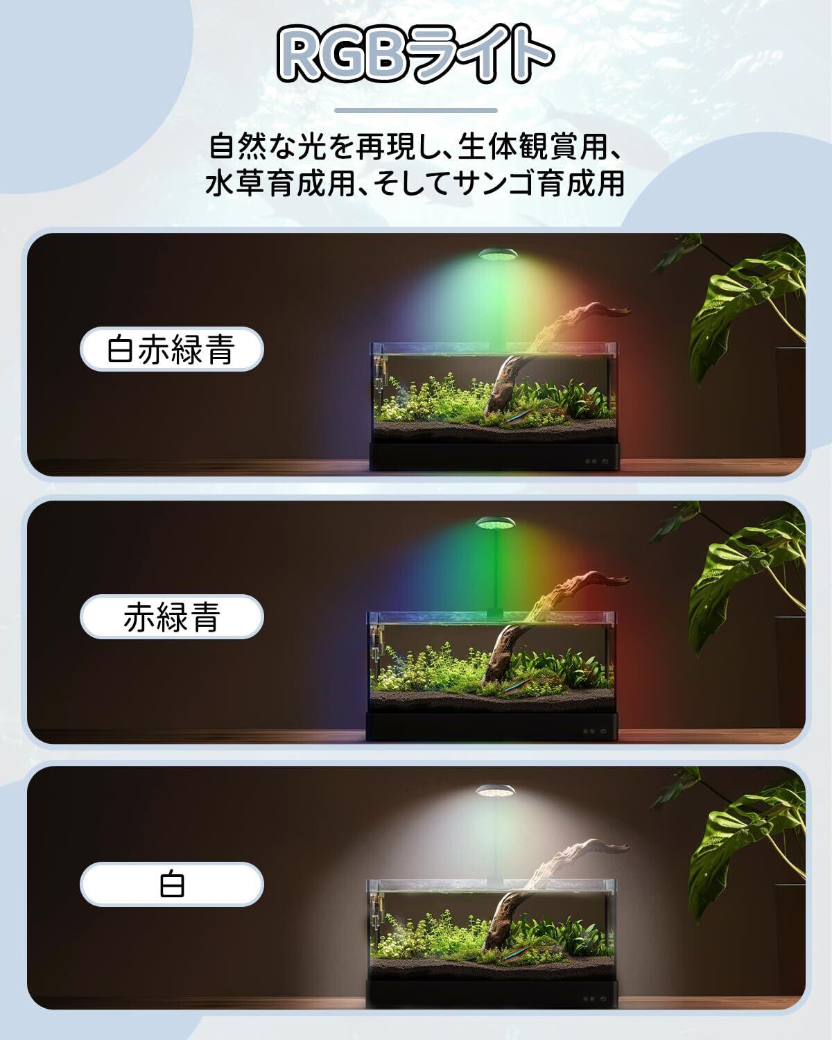 【3色点灯】HimaDana RGBライトは、白・赤・緑・青の4色LEDを組み合わせて3色点灯モードを実現しています。LEDの色は、白のみ、赤+青+緑、白+赤+青+緑の3種類があり、リモコンで切り替えることができます。自然な光を再現し、生体観賞用、水草育成用、そしてサンゴ育成用のLED照明として最適です。