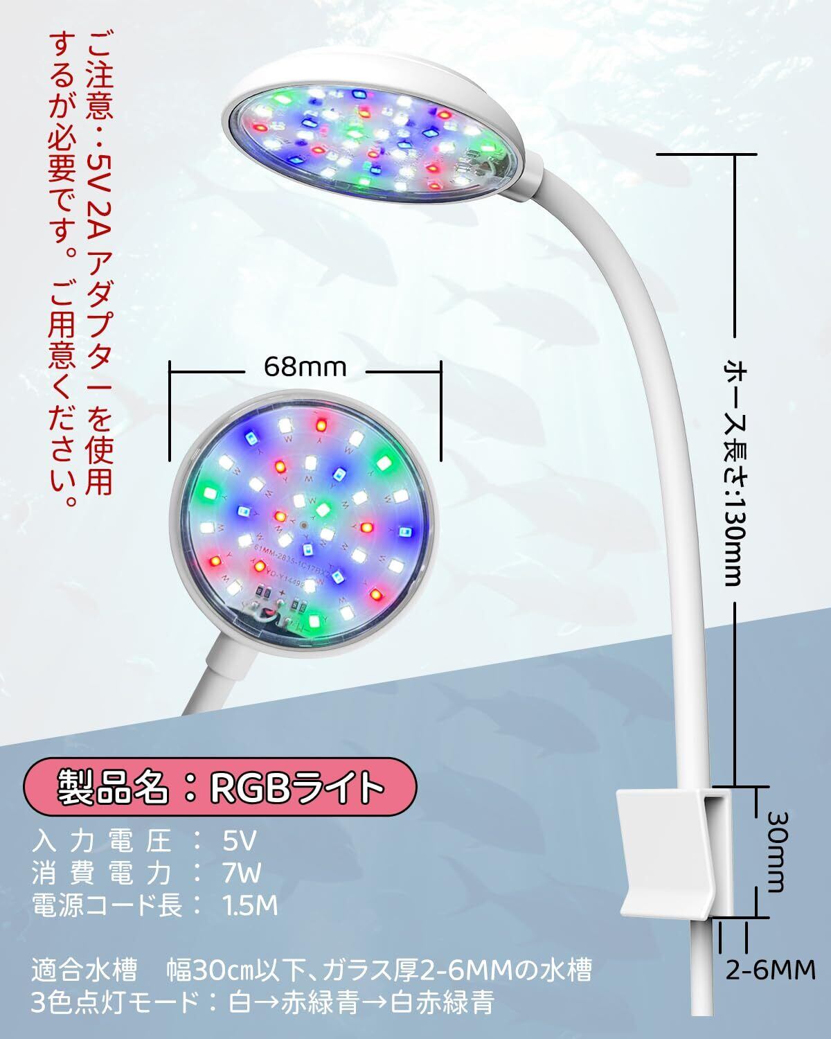 【ご注意】5V 2Aの電源アダプターを使用する必要があります。USBアダプターは付属していませんので、ご用意ください。 【発熱について】 LEDライトが点灯している際に発熱が生じるのは、正常な現象です。一般的に、水槽用ライトはコンパクトで低電圧設計のため、冷却ファンは搭載されておりません。そのため、市販の水槽用ライトにおいても発熱が見られるのは通常のことですので、どうぞご安心ください。