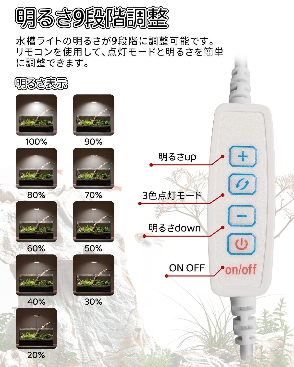 【明るさ9段階可能】 リモコンを使用して、点灯モードと明るさを簡単に設定できます。それ以外、メモリー機能もあって、一回電源をオフると前回の点灯モードと明るさの設定は保持されますので、再度調整が必要ありません。