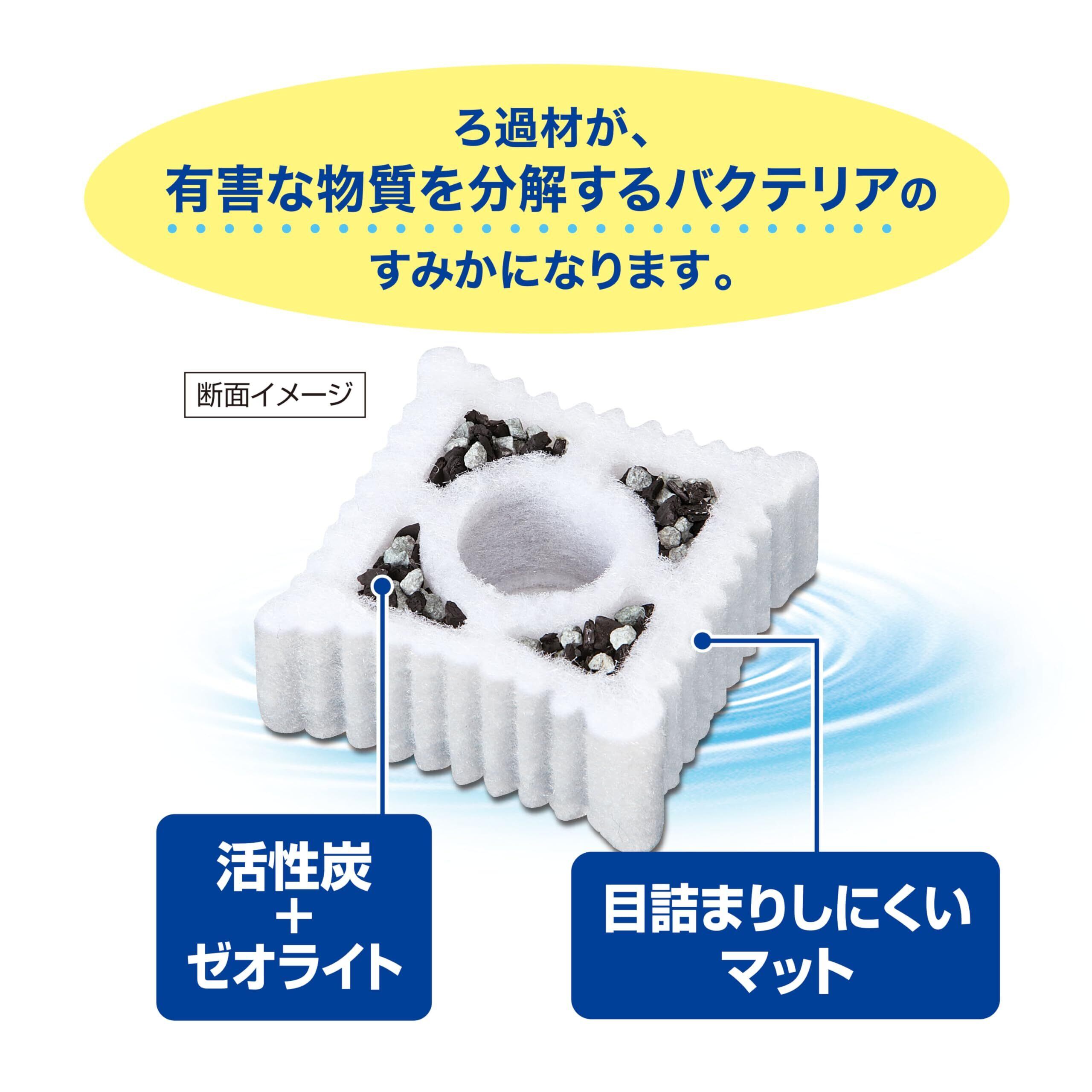 目詰まりしにくいマットの中に「活性炭」+「ゼオライト」を配合したろ過材が魚に有害な物質を分解するバクテリアのすみかになります。