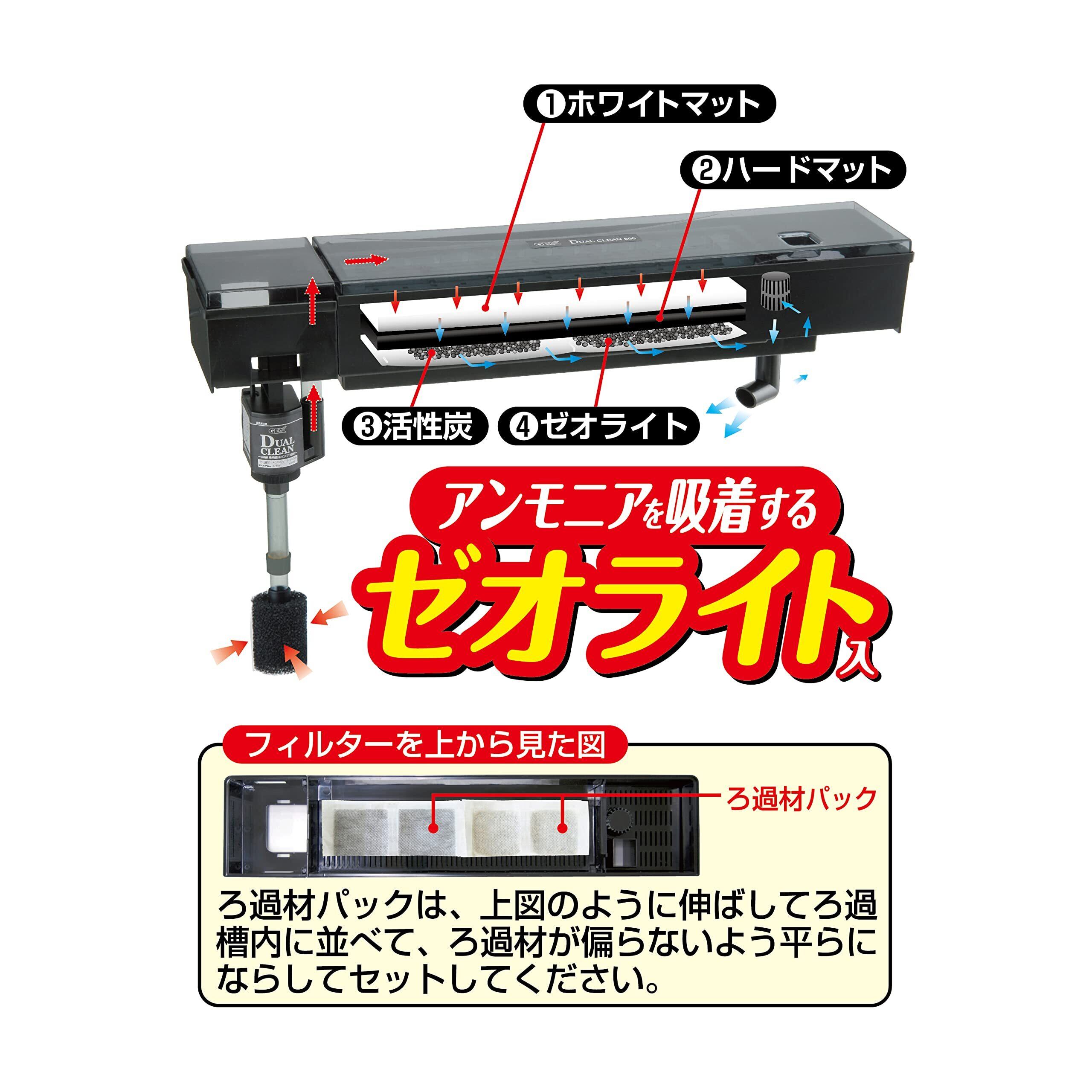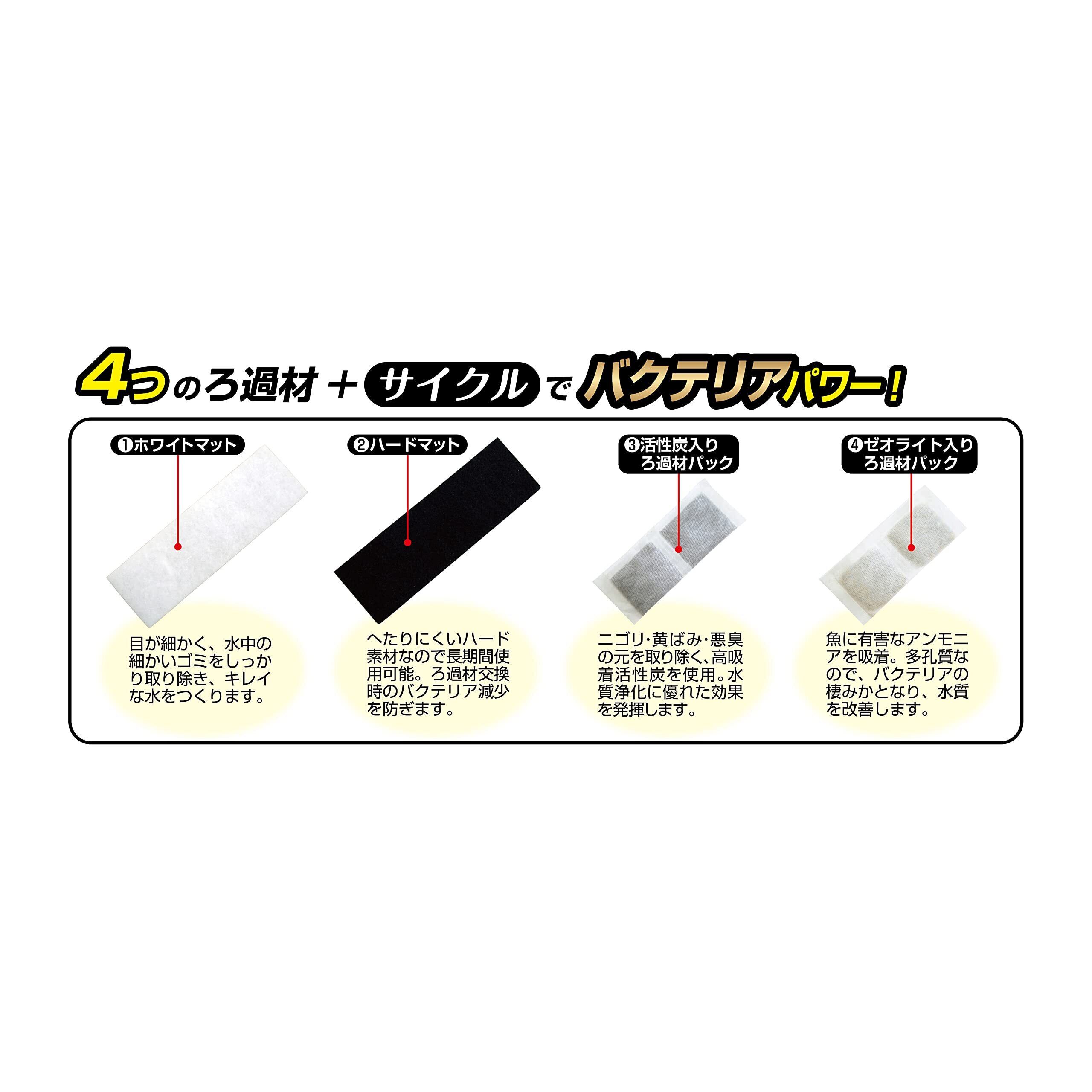 【各社共通タイプ】バクテリアパワー!もっと水キレイ!アンモニアを吸着するゼオライト入。ホワイトマット、ハードマット、活性炭入りろ過材パック、ゼオライト入りろ過材パックの4つのろ過材+生きたろ過バクテリア「サイクル」1回分が付いた上部フィルター用ろ過マット