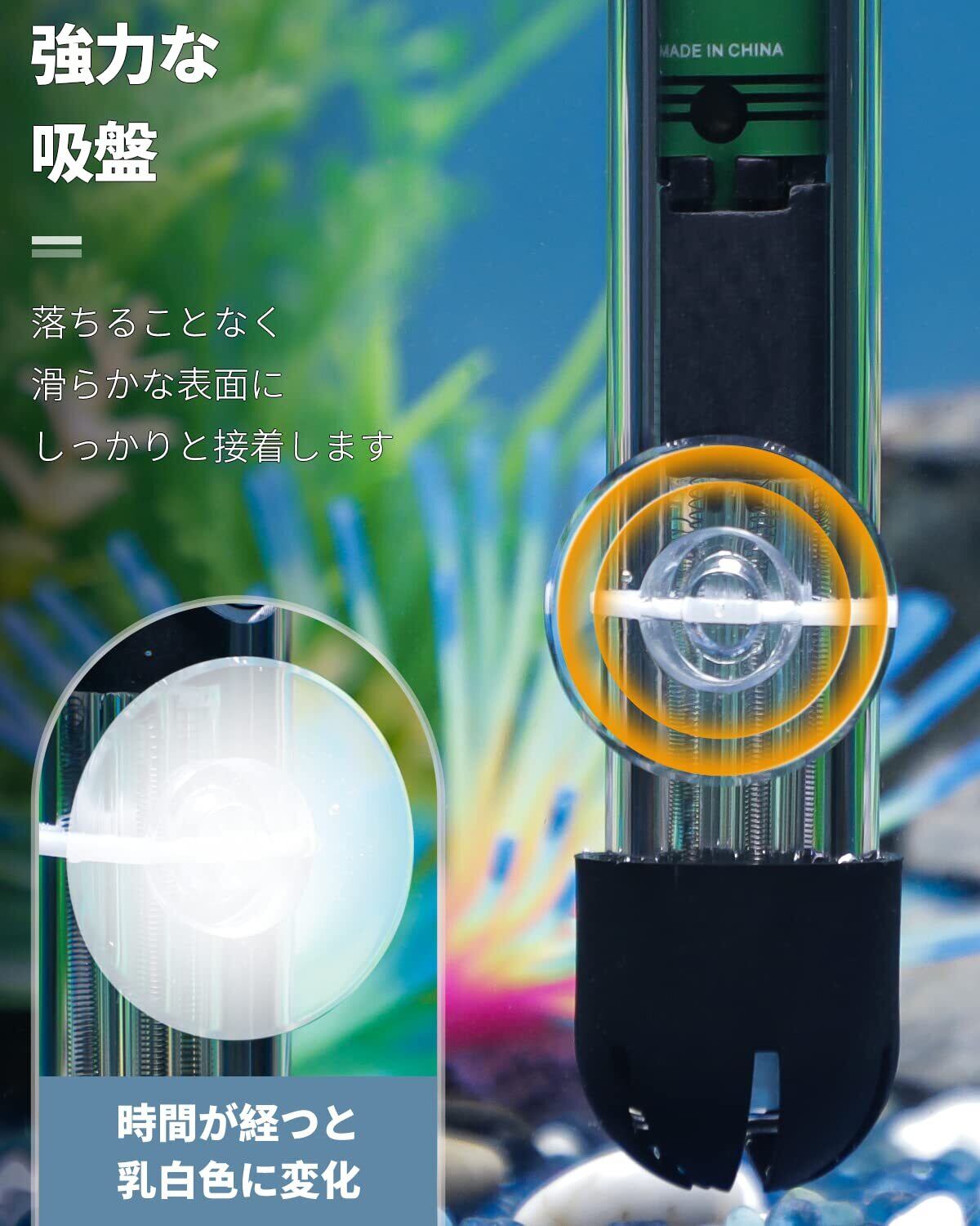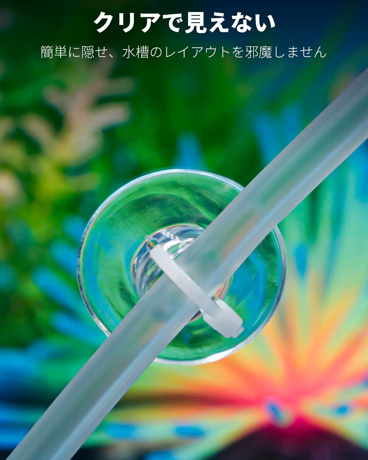 透明で見えない: 吸盤の直径: 2.5 cm。 ケーブルの長さ: 14.6 cm。 小さなサイズと透明性により、簡単に隠すことができ、水槽内のレイアウトを乱すことはありません。