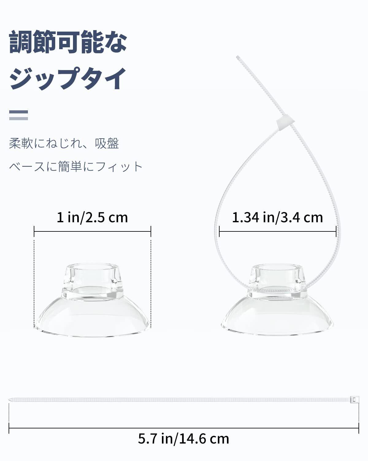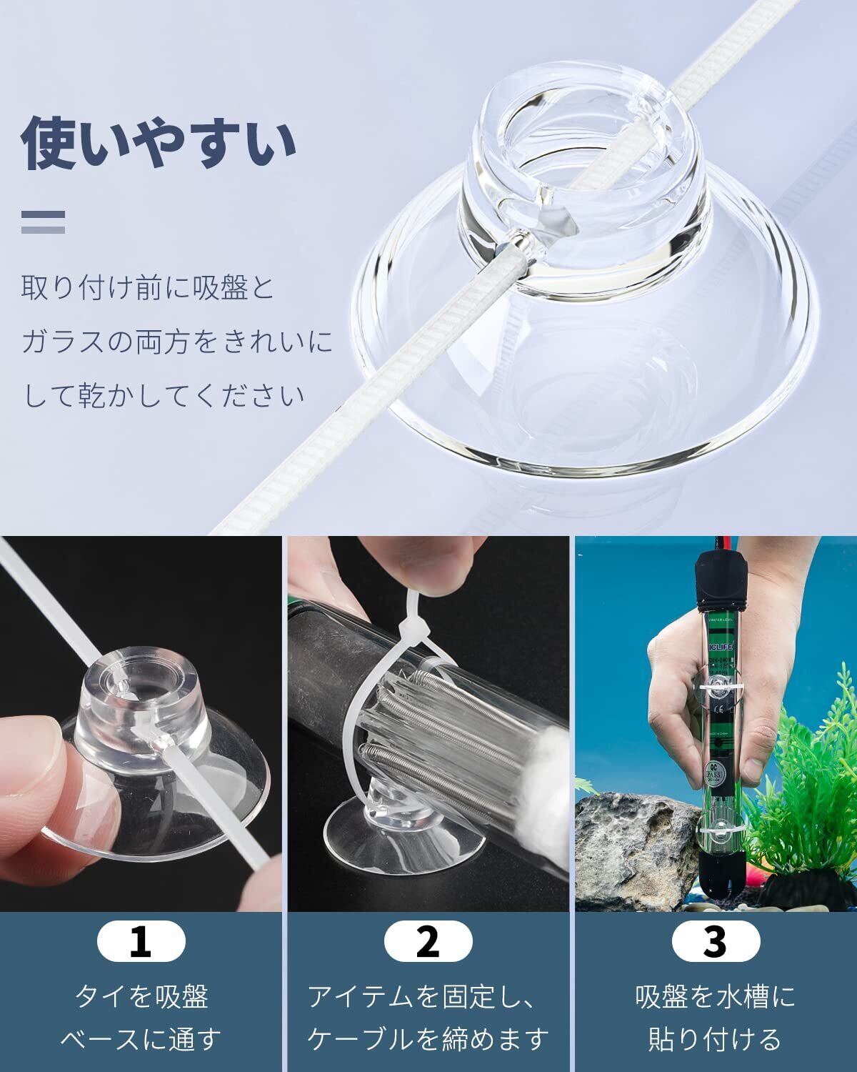 使い方は簡単:対象物を結束バンドで縛り、結束バンドの先端をもう一方の端の穴に通して締め、最後に吸盤を水槽に貼り付けます。
