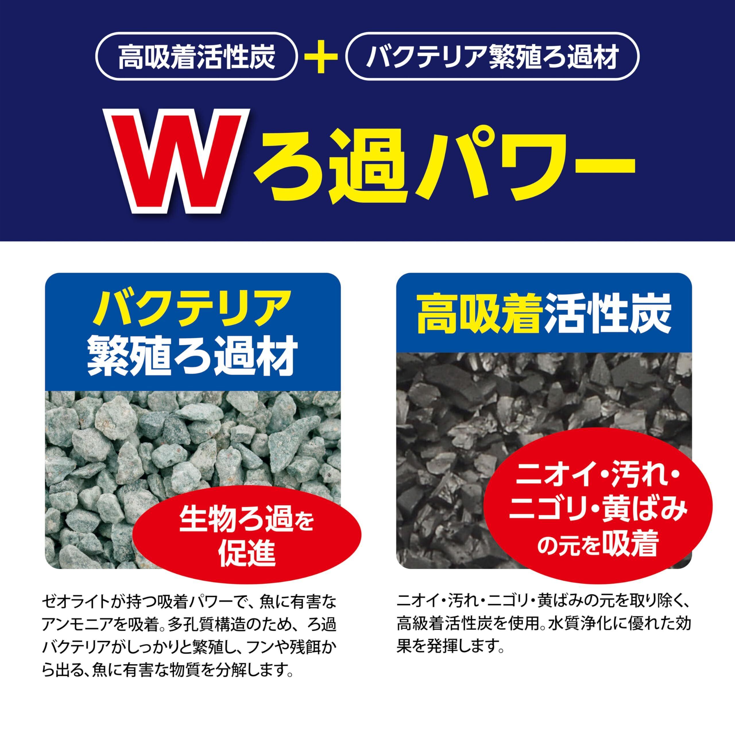外掛けフィルター用各社共通交換ろ過材 ●GEX・テトラ対応 各社共通交換ろ過材 ●簡単ラクラクパワーフィルターS/Mなどに使える幅8cmタイプ ●高吸着活性炭+バクテリア繁殖ろ過材のダブルろ過パワー 高吸着活性炭がニオイ・汚れ・ニゴリ・黄ばみの元を吸着、バクテリア繁殖ろ過材が生物ろ過を促進 ●フィットフレーム構造でフィルター本体にすき間なくセットできるので汚れを逃さずブロック! ●環境にやさしいバイオマスプラスチック使用 高吸着活性炭+バクテリア繁殖ろ過材 ダブルのろ過パワー! <高吸着活性炭使用>ニオイ・汚れ・ニゴリ・黄ばみの元を取り除く、高吸着活性炭を使用。水質浄化に優れた効果を発揮します。 <バクテリア繁殖ろ過材>ゼオライトが持つ吸着パワーで、魚に有害なアンモニアを吸着。多孔質構造のため、ろ過バクテリアがしっかりと繁殖し、フンや残餌から出る、魚に有害な物質を分解します。 <汚れを逃さずブロック>フィットフレーム構造でフィルター本体に隙間なくろ過材をセットでき、飼育水が効率よくろ過材を通るので細かいゴミが水槽内に戻るのを抑えます。 <お手入れ簡単>手を濡らさず、汚さず、簡単に交換できます。 <バイオマスプラスチック使用>環境に配慮しバイオマスプラスチック原料を使用。※フレーム部に約10% 製品サイズ:約幅8.0×奥行2.5×高さ13.5cm(1個あたり) 内容量: 7個
