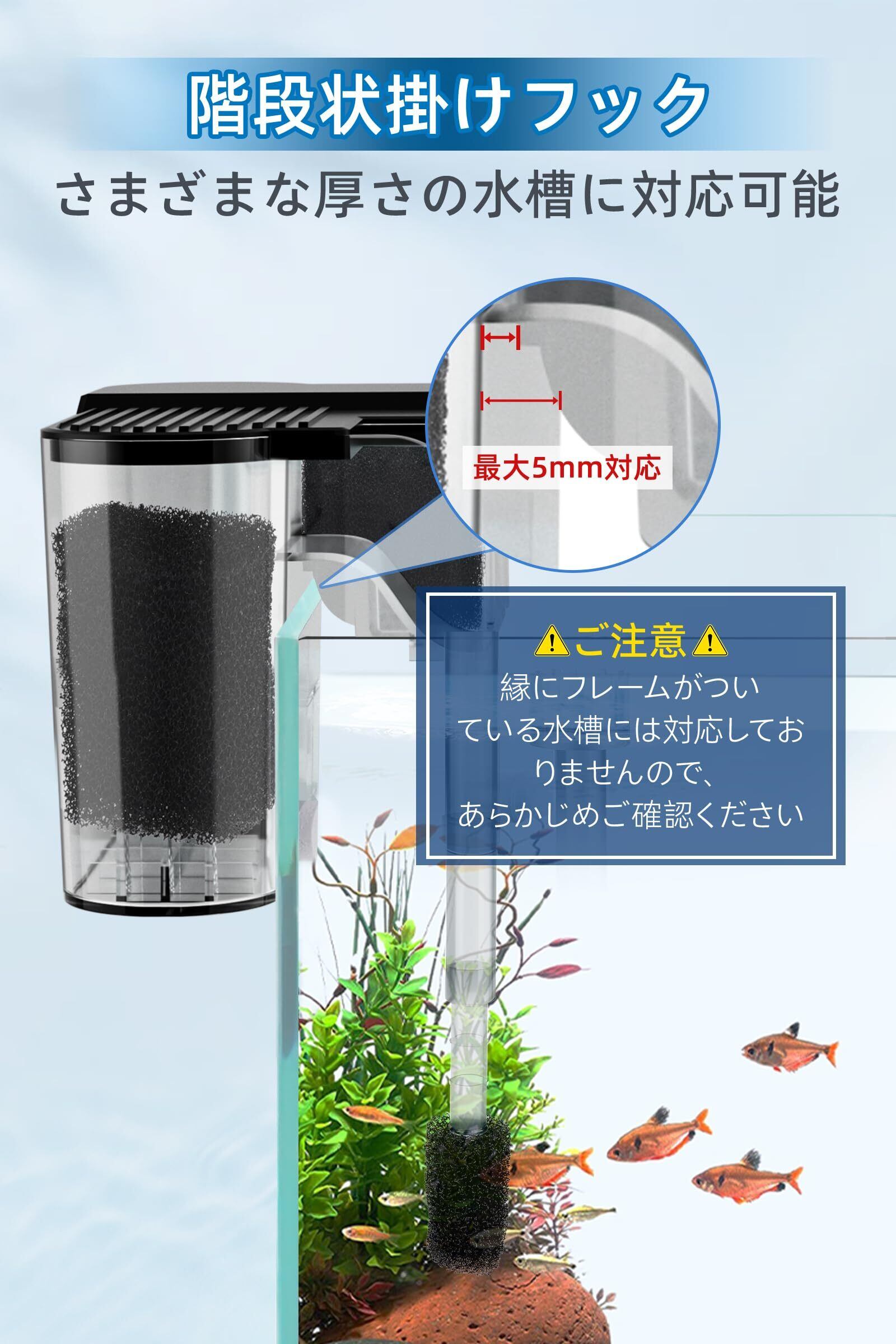 【5mm内のフチに引っ掛ける】水槽上部の縁に引っ掛けて使用する外掛け式水槽フィルターです。呼び水を加えてフィルターを起動すると、追加の操作をしなくても正常に動作します。掛けフックは階段状(5mm以内)のデザインが特徴で、様々な厚さの水槽ガラスにしっかりフィットします。ご注意:縁にフレームがついている水槽には対応しておりませんので、あらかじめご確認ください。