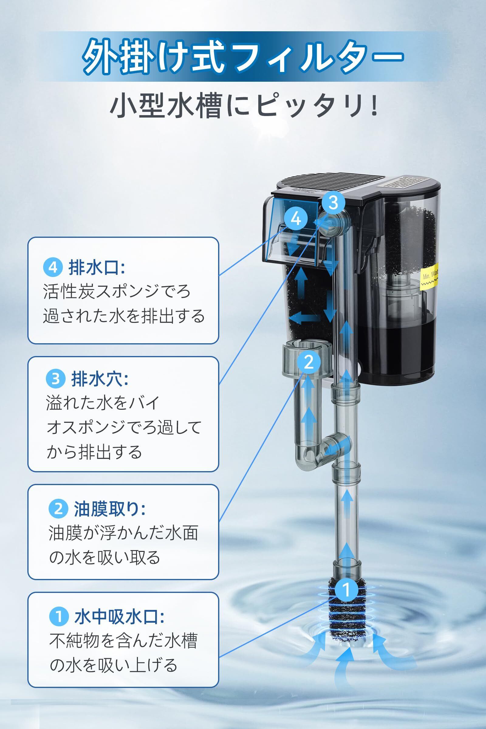 hygger 水槽フィルター 外掛け式フィルター 300L/H アクアリウム用フィルター 静音 水流調節 ろ過 水循環 熱帯魚 金魚 海水魚 メダカ