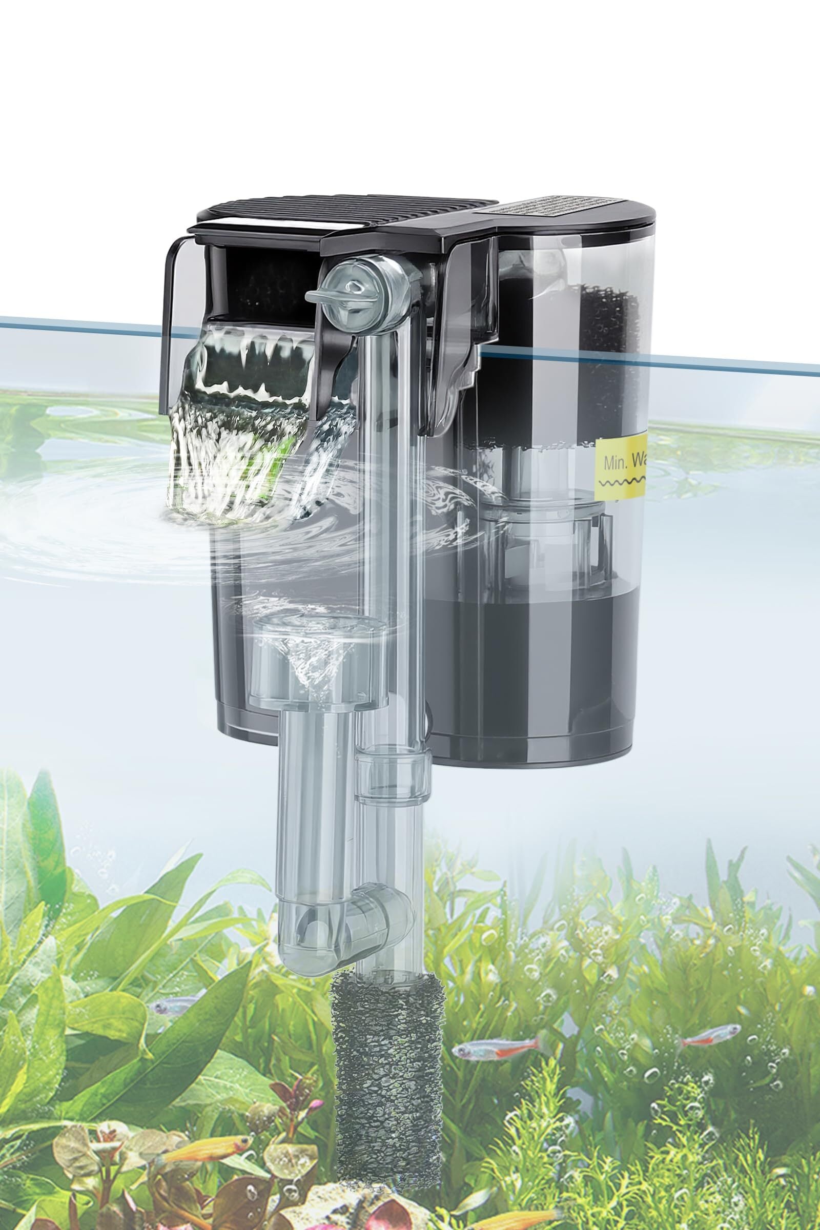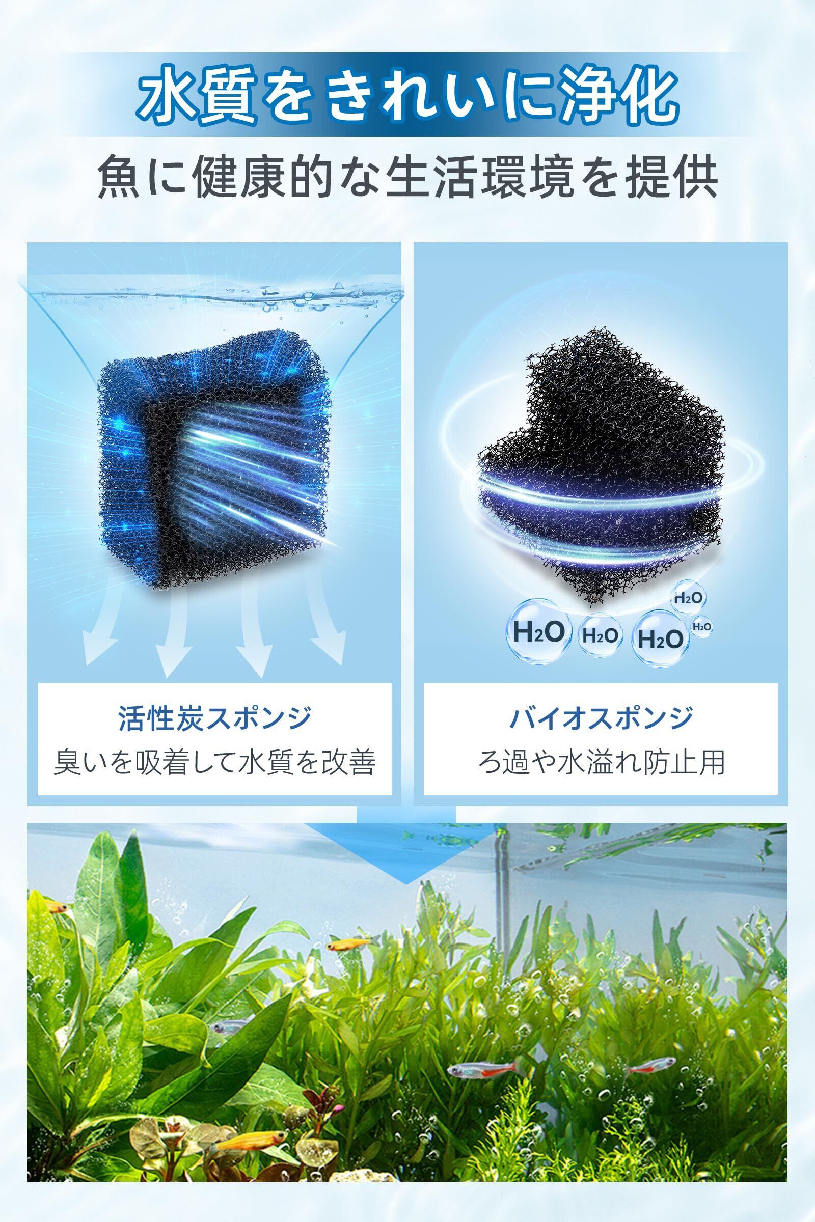 【酸素供給/吸い込まれ防止】吸い上げた水を落とす設計された水槽フィルターは、エアレーションの役割も果たし、水槽内の水流を循環させて酸素を効率的に供給します。魚やエビなどの水生生物が快適に生活できる理想的な環境を作り出します。さらに、入水口には専用のスポンジ保護カバーが装備されており、稚魚やエビが誤って吸い込まれるのを防ぐ安全設計となっています。