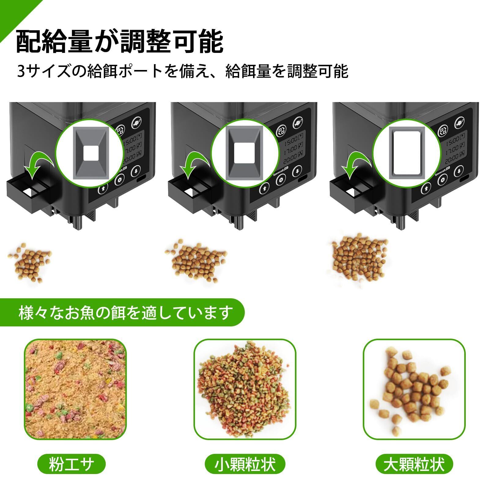 密閉式防湿設計-他の自動餌やり機にはいつも蓋が開いていて、魚食が湿ったり引っかかったりしやすいことに悩んでいますか? の自動給餌器は完全密封防湿設計で、給餌が終わるたびに開口部が自動的に閉じます。魚の餌が常に空気に触れないようにし、魚の餌の湿気の問題を解消します。 ペレット、ボール、パウダー、顆粒など、ほとんどの種類の餌に適しています。 (注意:フレーク状や帯状の飼料には適していません。)