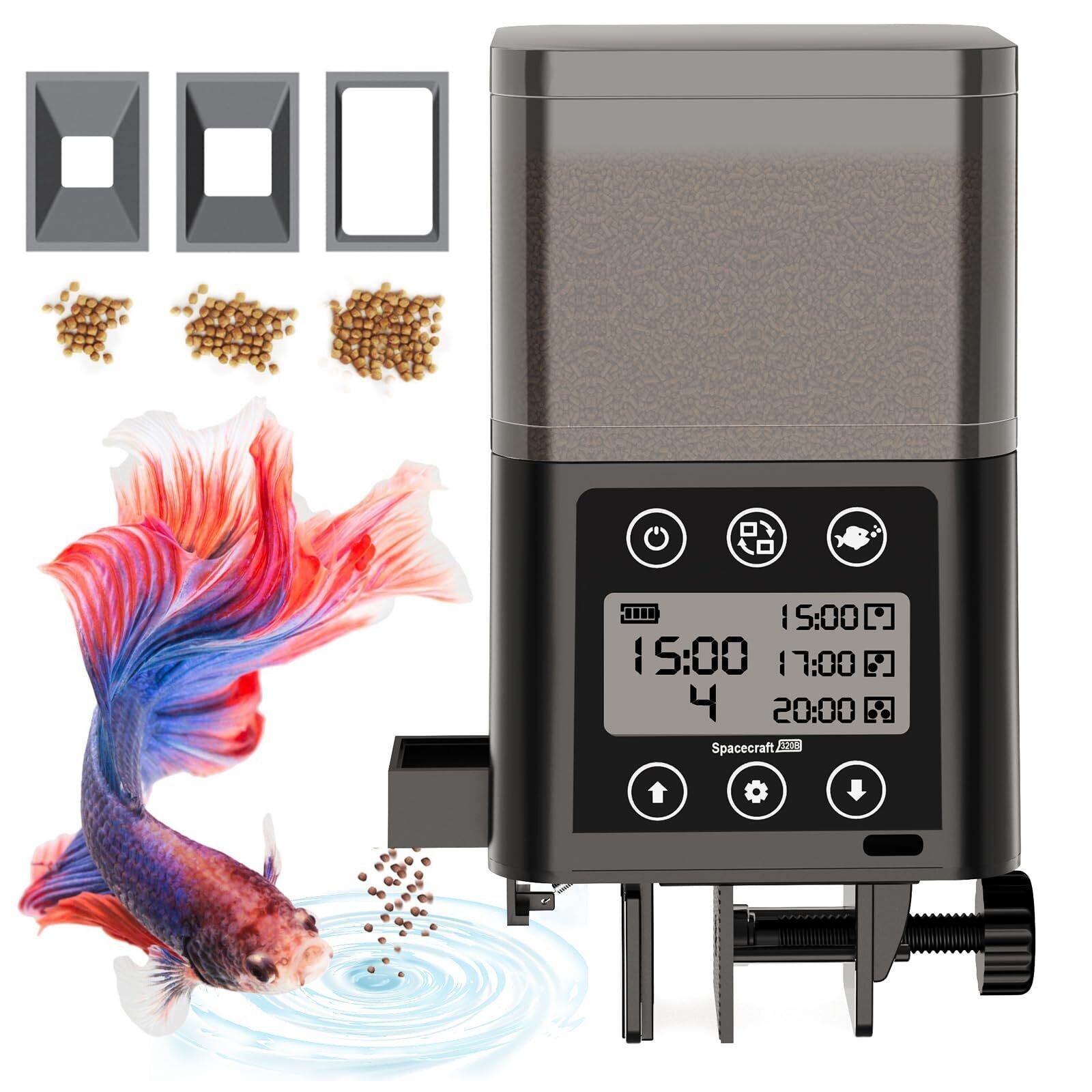 給餌量調整可能-魚自動給餌器はプッシュプル式給餌設計を採用し、3つの異なるサイズの交換可能な給餌クリップを装備し、給餌量を正確に制御することができます。本来の容量は120 ml+200 mlの重畳庫で、320 mlの大容量で、いつでも餌を追加する必要はありません。すべての水槽は科学的な餌を得ることができます!さまざまな水槽に適しており、カツオ、熱帯魚、金魚、亀、青魚などを飼う心配はありません。