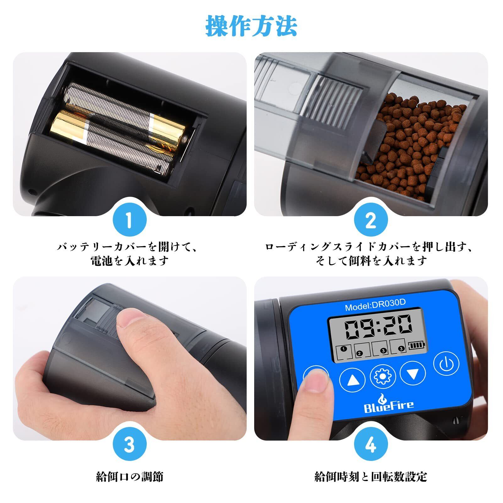 自動餌やり機:この魚自動給餌器はデジタルシステム制御、時間設定機能、液晶モニター表示、配線不要。注:充電式電池は使用しないで下さい。給餌量は一日中に4段階を設定でき、各段階には1-3回の餌を投入できます。給餌時間の設定が自由に変更できます。また、手動で餌を与え、餌の楽しさを体験することができます!