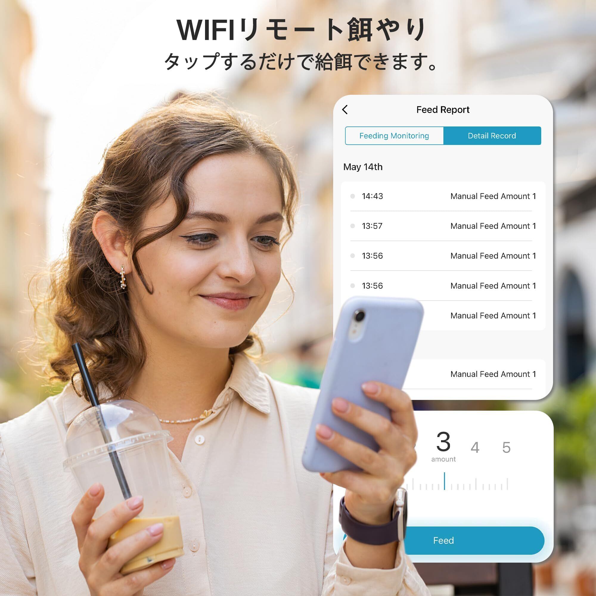 WiFiアプリでリモートコントロール:WiFi接続後、スマホのアプリでリモートで給餌時間を設定できます。すべての設定は自動的にアプリやフィーダーで同期します。さらに、電源切れた時、オフラインの通知は携帯に表示されます。電源に再び接続すると、自動接続になります。(注意:電源を常に接続した状態に保つ必要があります。そうでないと動作しません。)