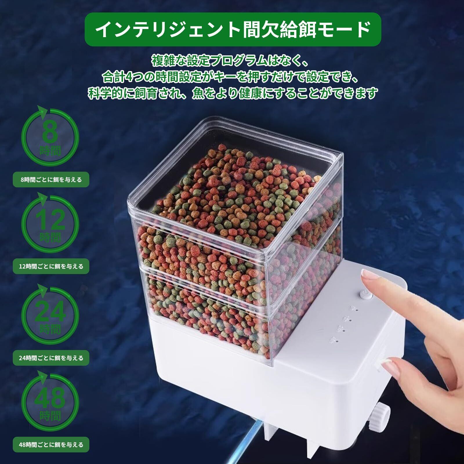 【4つの時間設定が可能でわかりやすい】この魚自動給餌器はデジタルシステム制御、時間設定機能、給餌量を調整する簡単な操作だけです。 また、超静音技術を採用し、音がほとんど聞こえません。 子供の昼寝に非常に適しています!魚の大きさに応じて48時間、24時間、12時間、8時間、餌の量を調整し、正確な給餌。自動飼料または手動飼料飼育が可能。