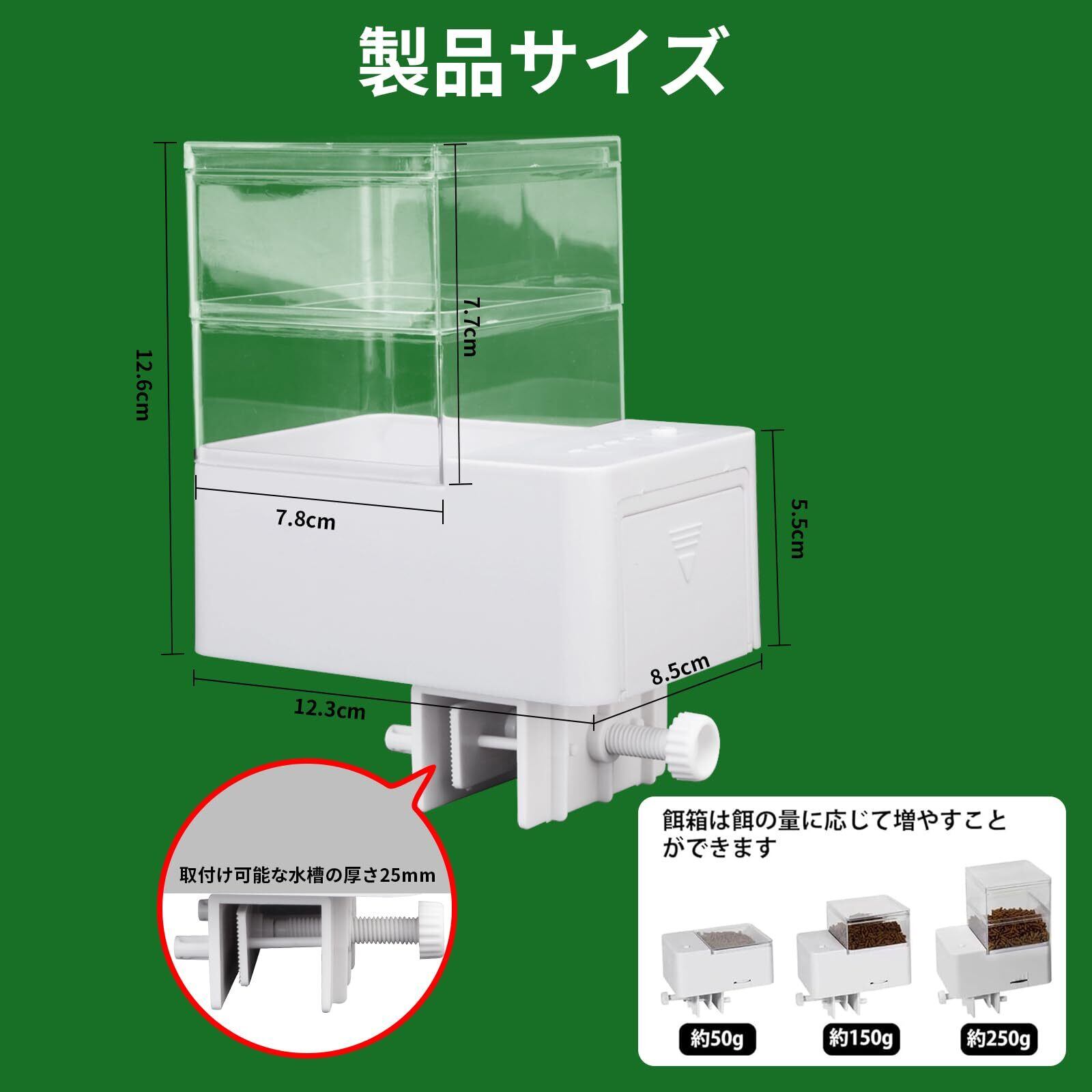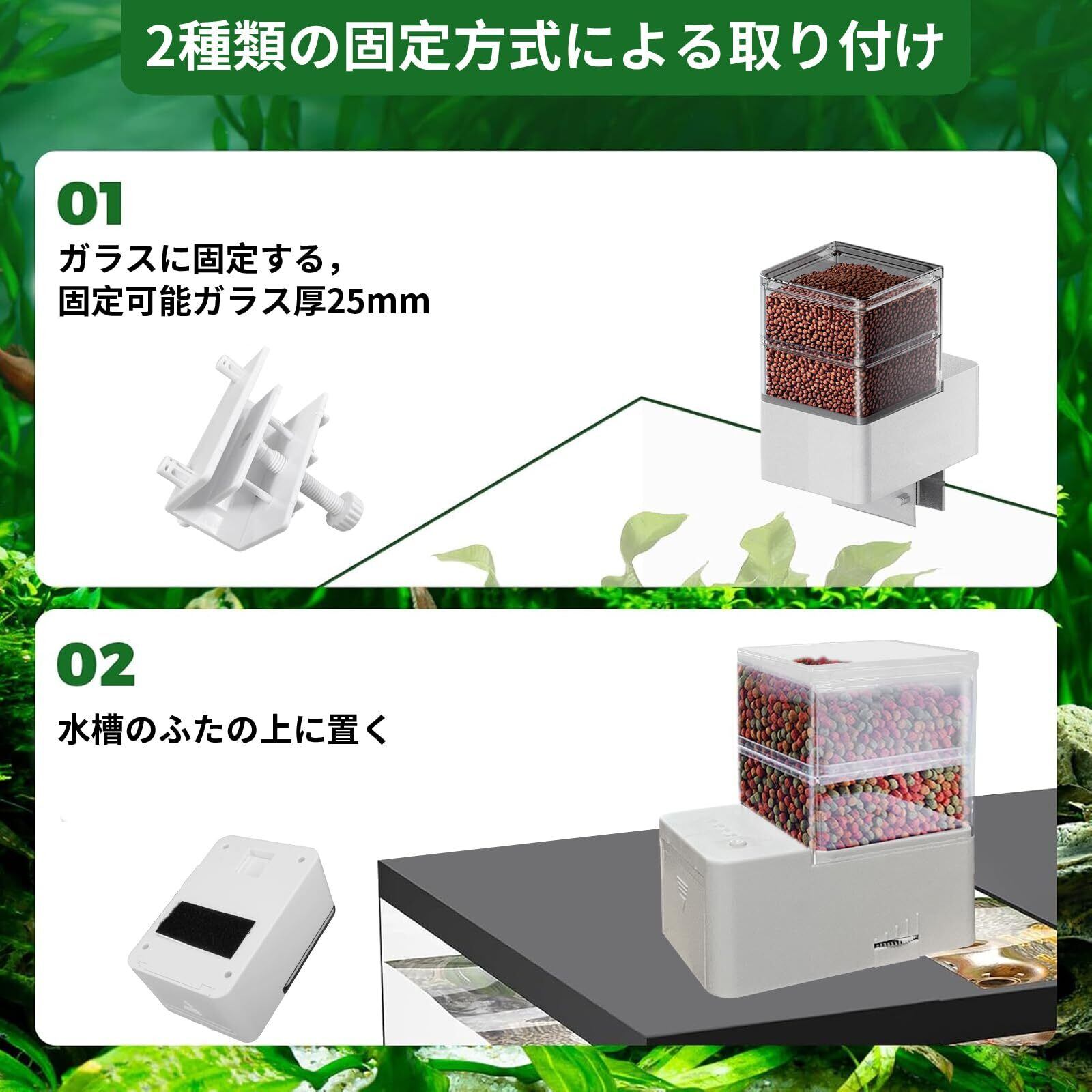 【2つの取り付け方】水槽の様式によって、自動餌やり機の取り付け方が2つあります。水槽のフチにクランプで固定すれば簡単に設置可能。あるいは固定シールで据え置けます。※注:水面の上は湿気があり、サケースの餌を乾いた状態に保つために、フィーダーが水位を超えていることを確認してください。常に、 餌ドームを清潔する必要がある。