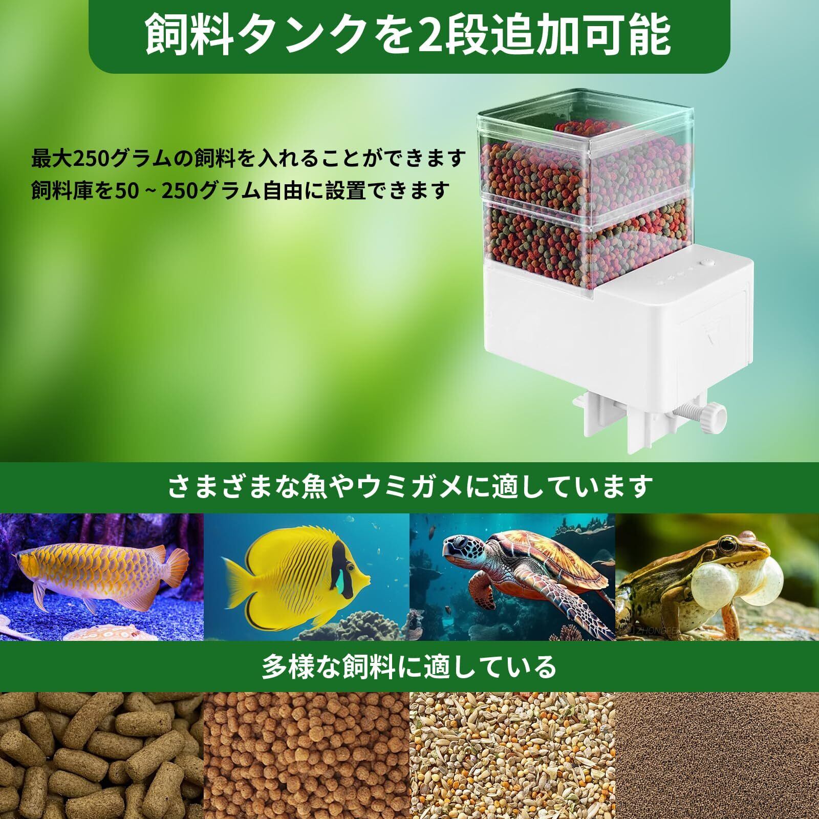 【乾電池式&実用性】このオートフィーダーは2本の単3電池だけで3−6か月間動作できます(バッテリが含まれていない)。従来のプラグ式電源より安全です。魚の餌タイマーを持っていれば、出張・お出かけの時、熱帯魚・金魚・亀・メダカ等の給餌心配がありません。500mlのエサケースはフレークタイプ、パウダータイプやストリップタイプ等の餌に適しています。さまざまな水槽や水族館に適用します。魚の飼料庫を自由に引き上げることができ、最大450グラムの飼料を入れることができる。