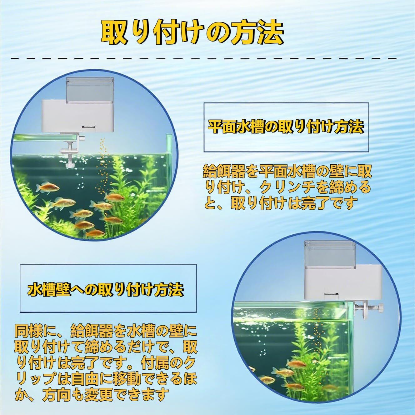 水槽の縁にクリップで固定する方法と、平面にスイングバック式で固定する方法の 2 種類を用意しています。お好みや水槽の形状に合わせて設置できます。