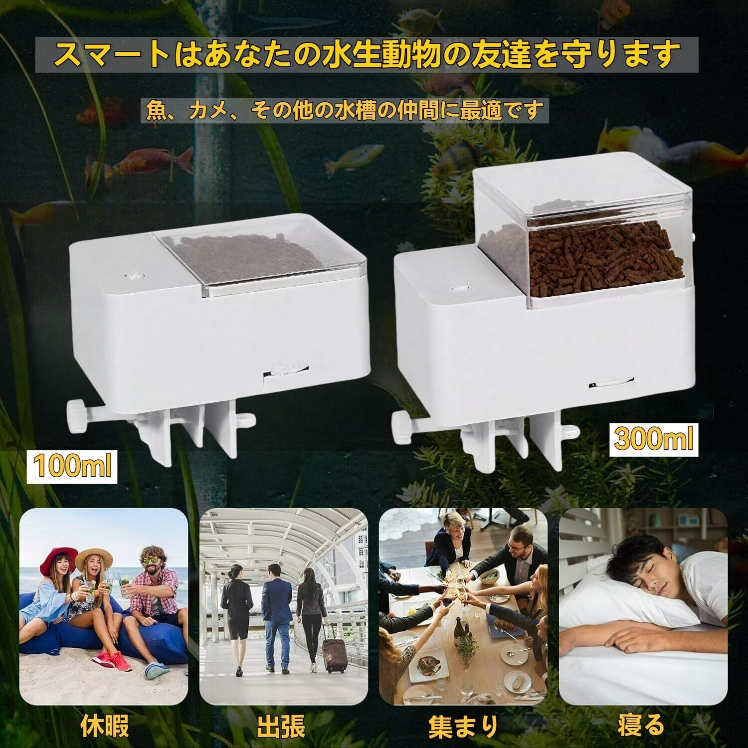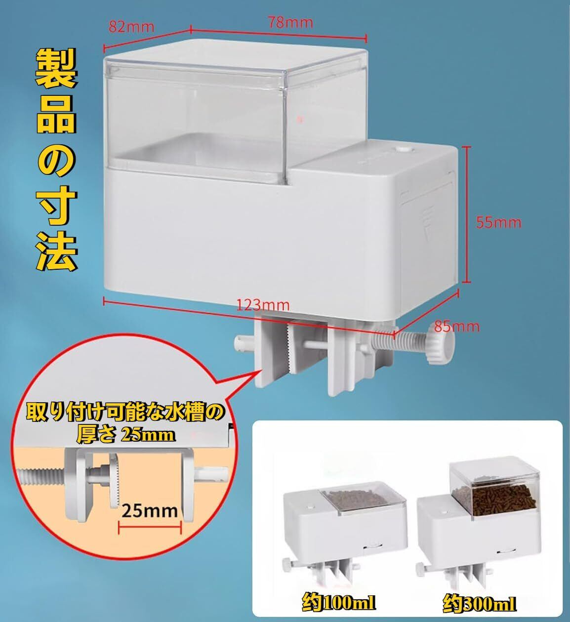【設計】: 容量 100ml、約 50g の餌/容量 300ml、約 150g の餌の給餌タンクを搭載し、長期間の自動給餌が可能です