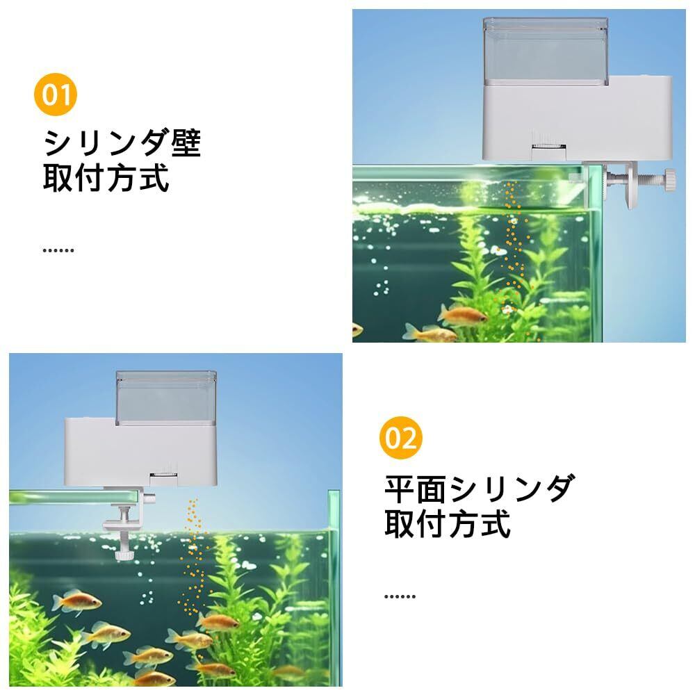 【2つの設置方法】水槽自動給餌器は異なるタイプの水槽に適した2つの異なる設置方法を提供します、縦型水槽の縁にクリップで簡単に固定でき、スイングバック固定タイプの向きを変えて水槽平面に固定することもできます、 様々なタイプの水槽に、ニーズに合わせてお選びいただけます。