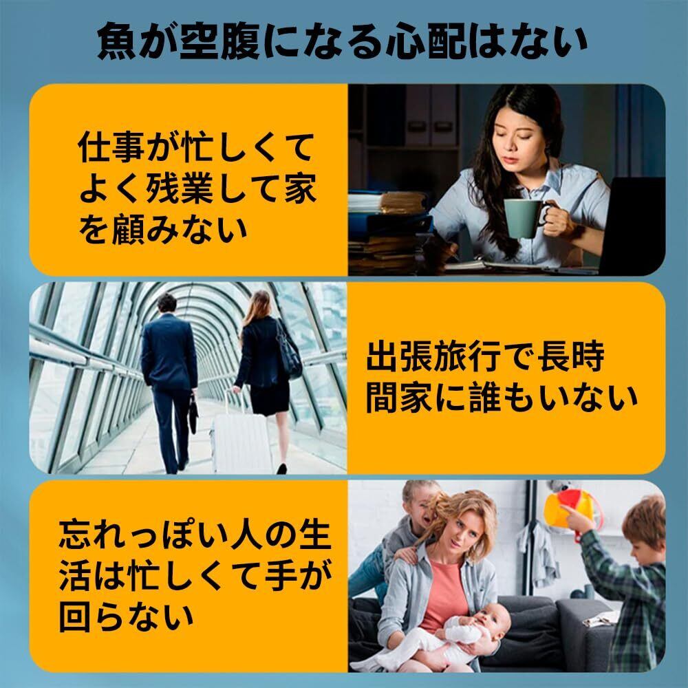 【使用シーン】1.長期旅行や外出時:長期間家を空ける際や忙しい日々に、魚の餌やりを心配することなく、定時で自動的に給餌してくれます。2. 家庭やオフィス:静音設計で家庭やオフィスなどの静かな環境でも気にせず使用できます。3.魚の初心者や忙しい方:手動で餌やりする時間がない方や、魚の飼育初心者にも簡単に使用でき、手間を省いて管理できます。